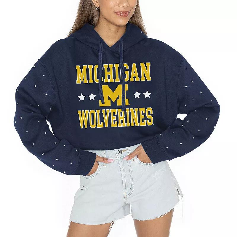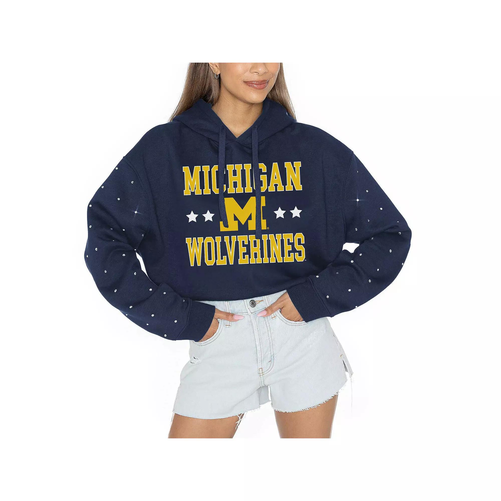 Add some sparkle to your game day look with this Michigan Wolverines Can't Lose Rhinestone Cropped Pullover Hoodie from Gameday Couture. This cropped hoodie features a trendy dropped shoulder for a relaxed fit and a touch of style. The midweight design is perfect for moderate temperatures, making it a versatile addition to your Michigan Wolverines-inspired wardrobe.Add some sparkle to your game day look with this Michigan Wolverines Can't Lose Rhinestone Cropped Pullover Hoodie from Gameday Couture. This cropped hoodie features a trendy dropped shoulder for a relaxed fit and a touch of style. The midweight design is perfect for moderate temperatures, making it a versatile addition to your Michigan Wolverines-inspired wardrobe.PRODUCT FEATURESMaterial: 100% PolyesterOfficially licensedHoodedPulloverLong sleeveTeam logo printed at center torsoBrand: Gameday CoutureMachine wash, tumble dry lowImportedRhinestone embellishments on sleevesMidweight hoodie suitable for moderate temperaturesCropped designDropped shoulder for a trendy look and relaxed fitTeam wordmark printed across torso Color: Navy. Gender: female. Age Group: adult.