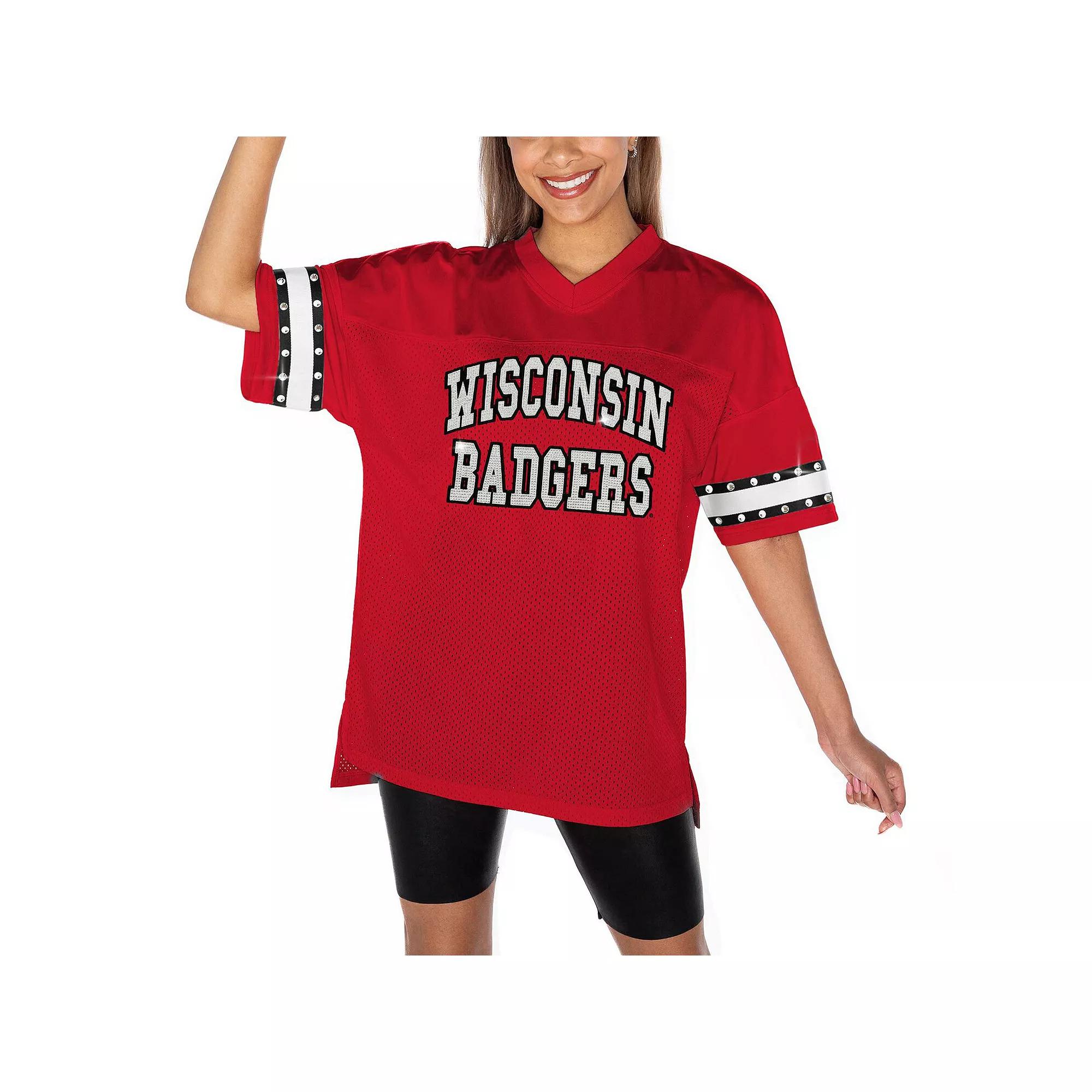 Countdown to kickoff in style with this Wisconsin Badgers Until Kickoff Rhinestone Fashion T-Shirt from Gameday Couture. This stylish top features a flattering droptail hem with side splits and is crafted from breathable mesh fabric for all-day comfort. Eye-catching fabric applique with rhinestone accents on the front and screen print stripes on the sleeves add a touch of sparkle to your game day look.Countdown to kickoff in style with this Wisconsin Badgers Until Kickoff Rhinestone Fashion T-Shirt from Gameday Couture. This stylish top features a flattering droptail hem with side splits and is crafted from breathable mesh fabric for all-day comfort. Eye-catching fabric applique with rhinestone accents on the front and screen print stripes on the sleeves add a touch of sparkle to your game day look.PRODUCT FEATURESShort sleeveFabric applique with rhinestone accents on frontMachine wash, tumble dry lowOfficially licensedV-neckScreen print stripes on sleeves with rhinestone accentsMaterial: 100% PolyesterMesh fabricImportedBrand: Gameday CoutureDroptail hem with side splits Gender: female. Age Group: adult.
