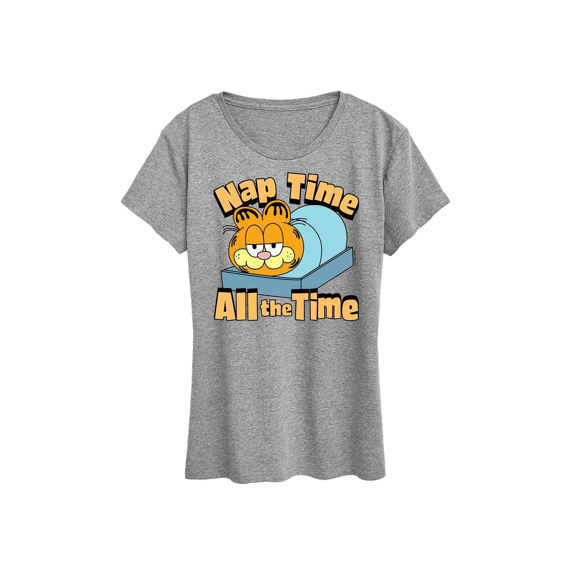 Heather Gray Garfield Nap Time All The Time Graphic Tee - Women & Plus. Tee featuring a classic crewneck collar and sun-friendly short sleeves. Full graphic text: Nap time all the time.Size S: 26 long from high point of shoulder to hemSize & fit: Relaxed-fit garment with a slightly longer hem. Fits true to size.50% cotton / 50% polyesterMachine wash; tumble dryImported, screen printed in the USA