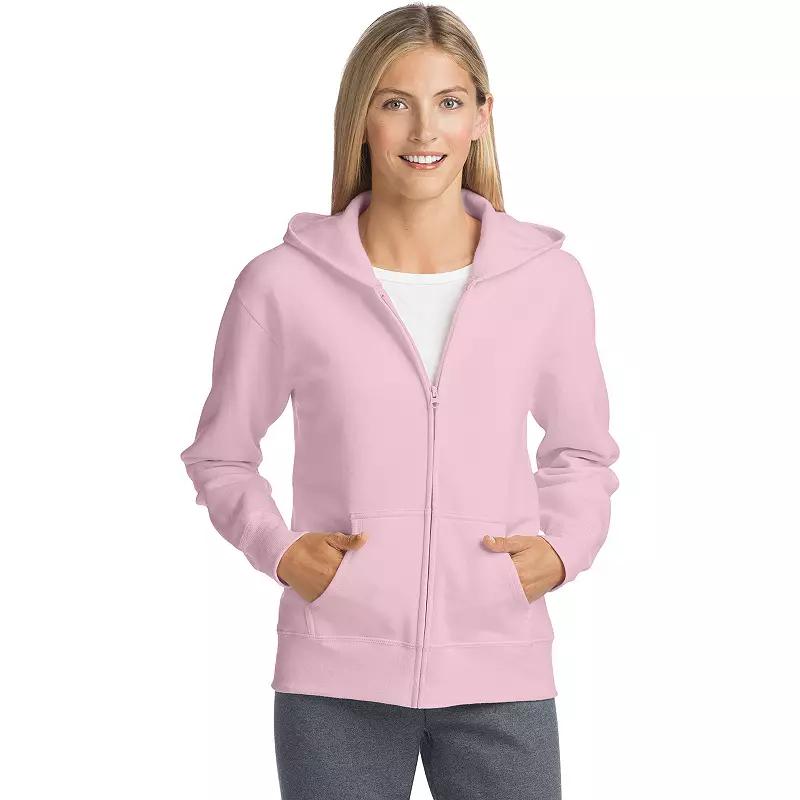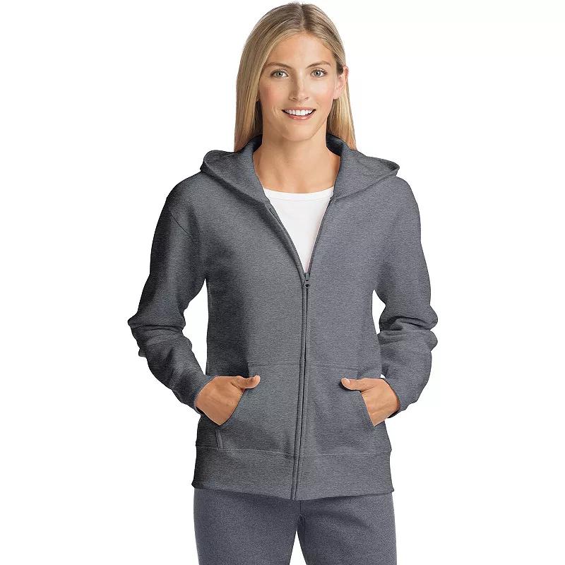 EFFORTLESS COMFORT Whether its before or after your workout, this Hanes Eco Smart womens hoodie delivers the versatility and comfort you demand. Midweight, high-density fleece fabric ensures lasting warmth and coziness, making it a must-have in your collection. The full-zip front and cord-free hood offer a timeless look thats made for layering. Stretchy ribbed cuffs and waistbands move with you, maintaining their shape over time. Front pouch pockets offer convenience for your essentials. Embrace this cozy loungewear - consider grabbing one in every color. FLEECE TO FEEL GOOD ABOUT - Hanes Eco Smart fleece womens hoodie is made with cotton sourced from American farms. STURDY STUFF - High-stitch density lasts longer without pilling. ZIP FRONT - Features front-zip closure for easy on-and-off. HOODIE STYLING - A cord-free hood helps block out wind and chill. FRONT POCKETS - Roomy front pouch pockets create the perfect storage place for your phone, wallet, and more. RIBBED DETAILS - Features ribbed cuffs and hem that keep their shape throughout the day. COLD WATER WASH - Hanes recommends washing womens zip hoodies in cold water to reduce energy usage.