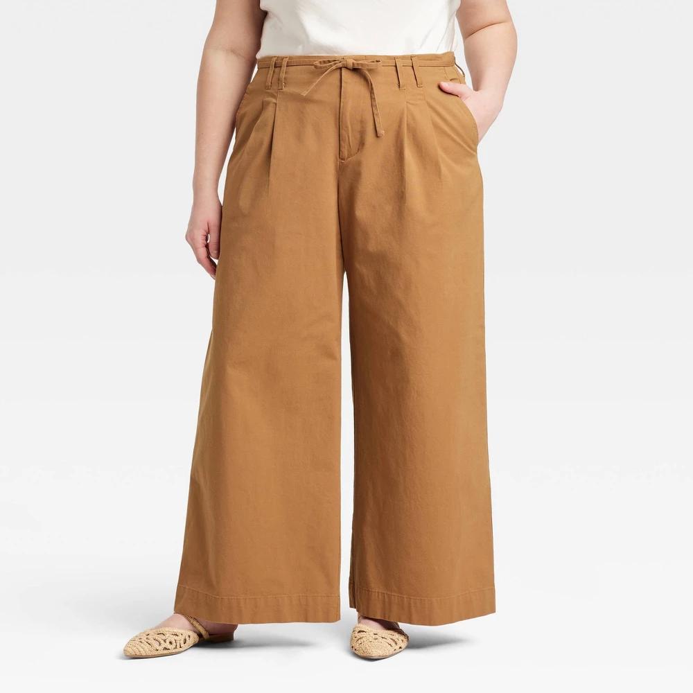 Elevate your everyday wardrobe with these High-Rise Wide-Leg Chino Pants from A New Day. These high-rise chino pants are made of soft, stretchy woven fabric thats tailored in a wide-leg fit for breathable comfort. The pants have a fly hook and zipper closure with a front drawstring for a stay-put fit, and side pockets provide space for stashing small on-the-go essentials. A New Day: Style that goes wherever you do.