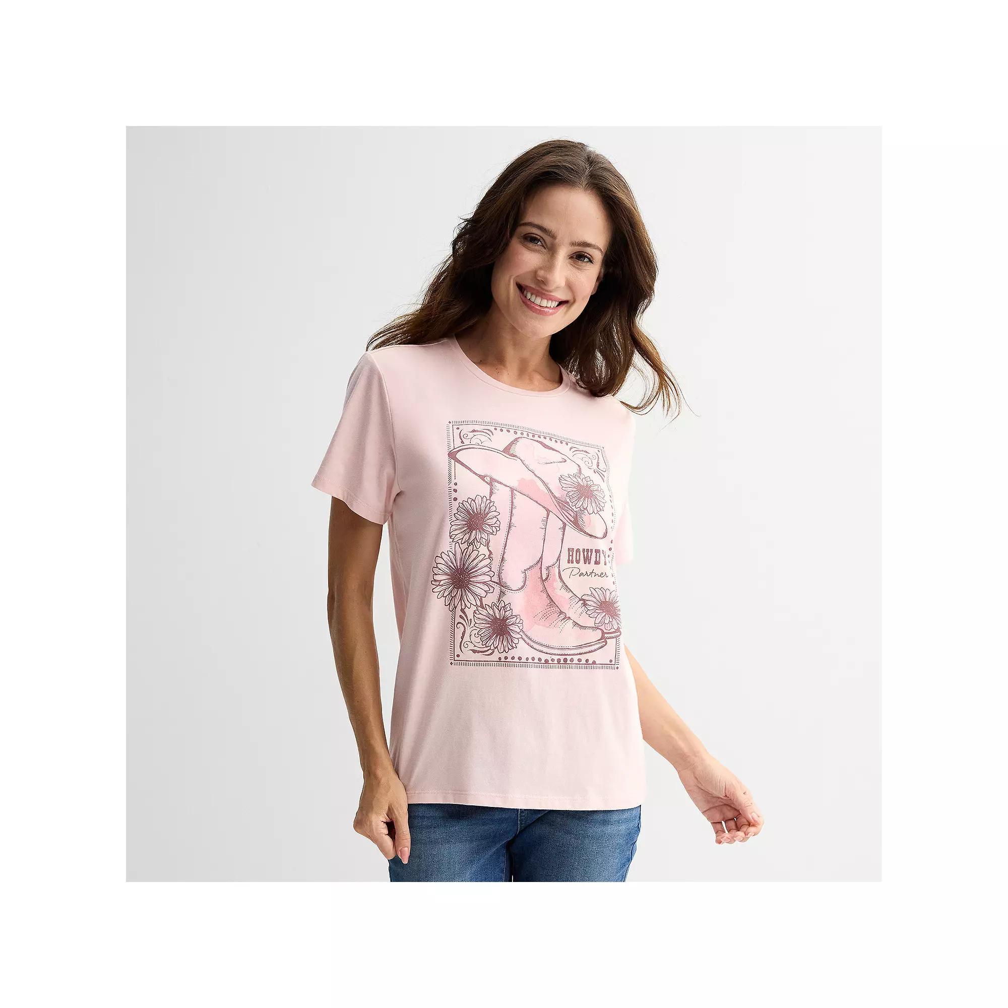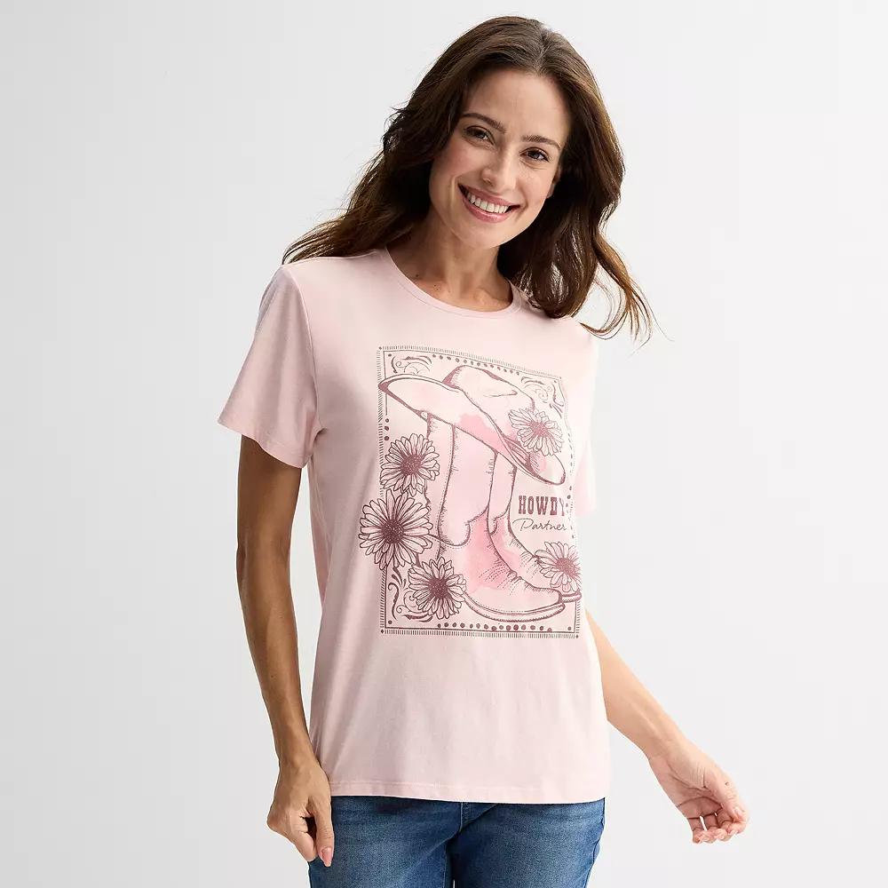 Add a touch of whimsical charm to your casual wardrobe with this delightful graphic tee from a leading brand. Featuring a playful "Howdy Partner" design, this shirt effortlessly brings a fun vibe to any outfit, making it perfect for laid-back weekends or everyday adventures. Click on this WOMEN'S GUIDE to find the perfect fit and more! - https://www.kohls.com/feature/womens-fit-guide.jsp. FEATURES: Crewneck, Short sleeves, Screen print graphic, Jersey knit fabric. FABRIC & CARE: Cotton, polyester, Machine wash, Imported. Size: Small. Color: Peachskin. Gender: female. Age Group: adult. Material: COTTON / POLY.