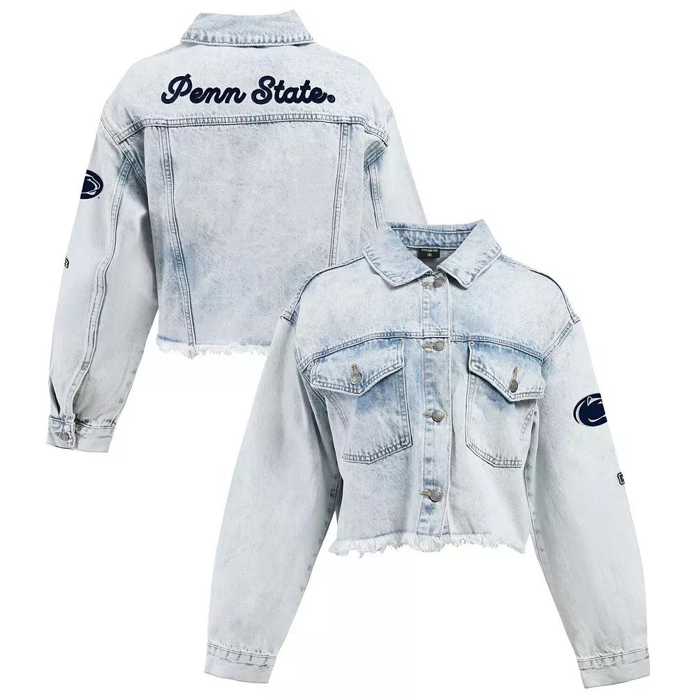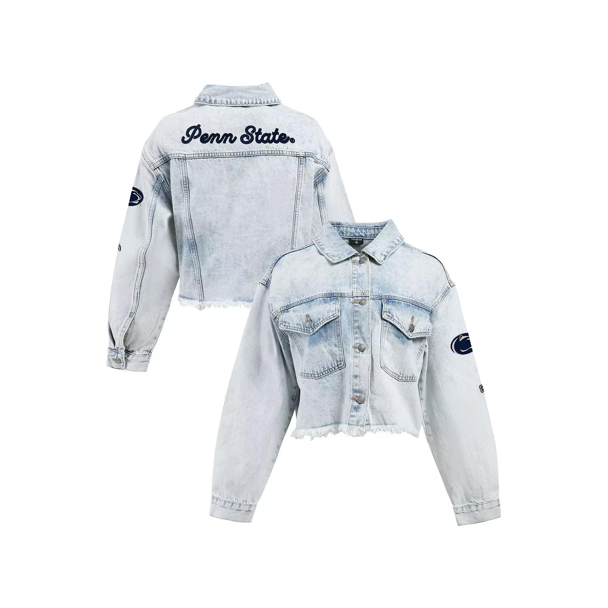 Make a fashion statement on Penn State Nittany Lions game day in this Lightwash Cropped Button-Up Jean Jacket from Hype and Vice. Featuring classic denim fabric with a washed design, its trendy and timeless look provides a versatile addition to your wardrobe. The embroidered team logo on the left sleeve and patches displayed across the back showcase your Penn State Nittany Lions fandom in style. Embroidered team logo on left sleeve. Full-button front. Imported. Team name in heat-sealed chenille patches across the back. Short sleeve. Midweight jacket suitable for moderate temperatures. Material: 100% Cotton. Two side pockets. Cropped raw-edge hem hits at the waist. Two chest pockets with button closure. Brand: Hype and Vice. One-button cuffs. Officially licensed. Machine wash, tumble dry low. Color: Turq A. Gender: female. Age Group: adult.