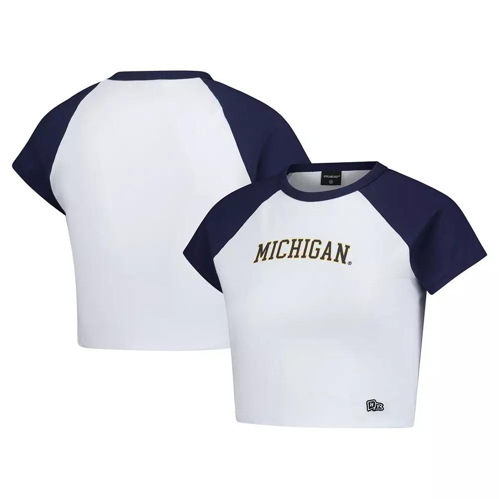 Show off your school pride in style with this Michigan Wolverines Homerun Cropped Raglan T-Shirt from Hype and Vice. The raglan sleeve design ensures easy mobility, allowing you to cheer on the Michigan Wolverines with unrestricted movement. The cropped hem adds a touch of modern flair, making it a stylish addition to your game day wardrobe. Raglan sleeves for greater freedom of movement in the shoulders and arms. Machine wash with garment inside out, tumble dry low. Cropped length. Team wordmark printed across front. Officially licensed. Brand: Hype and Vice. Imported. Short sleeve. Crew neck. Material: 95% Cotton/5% Spandex. Color: Navy. Gender: female. Age Group: adult.