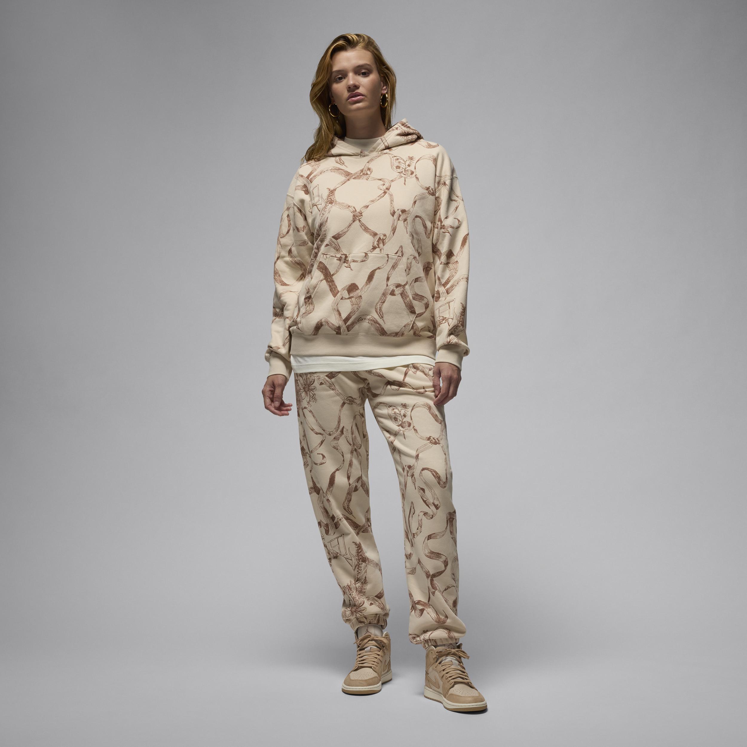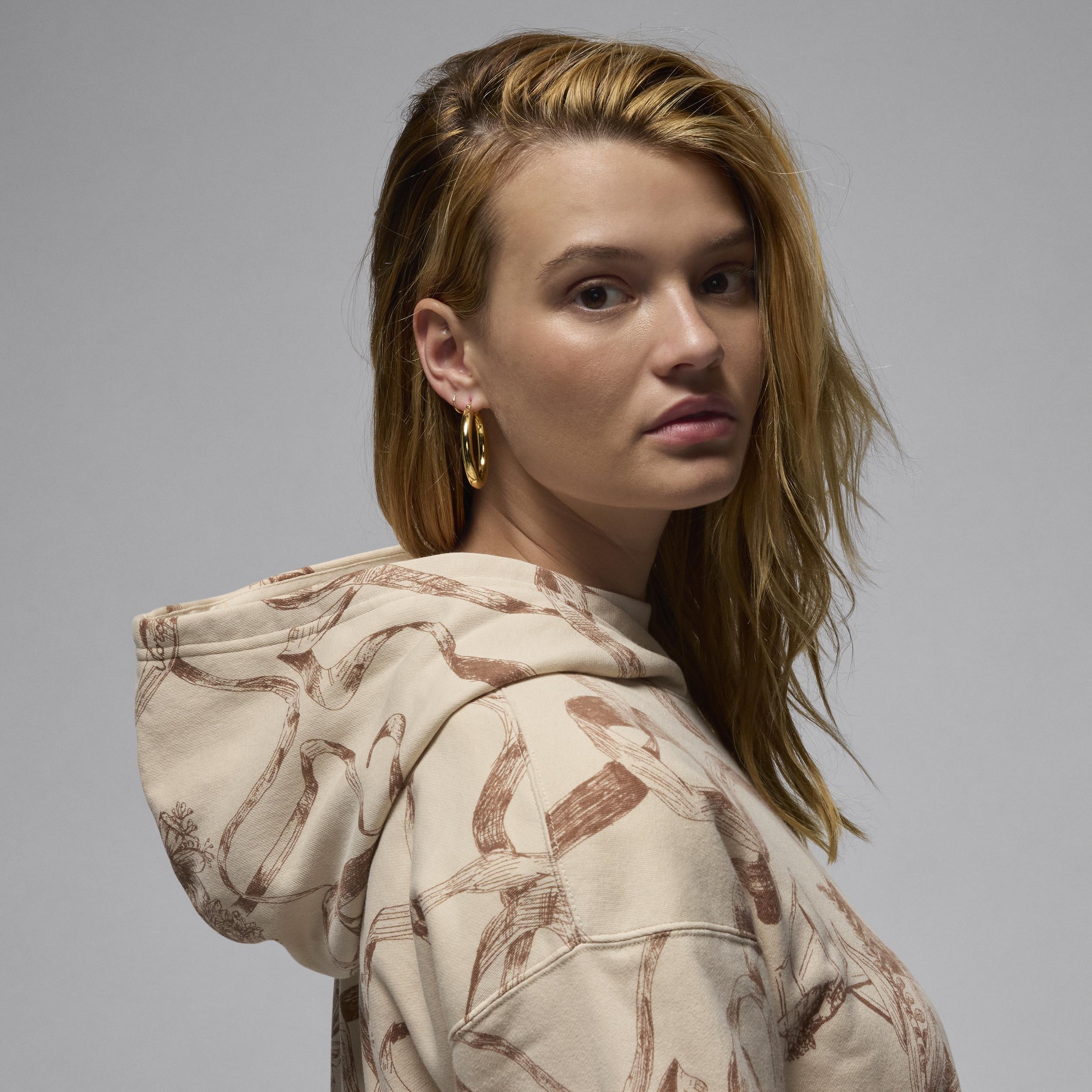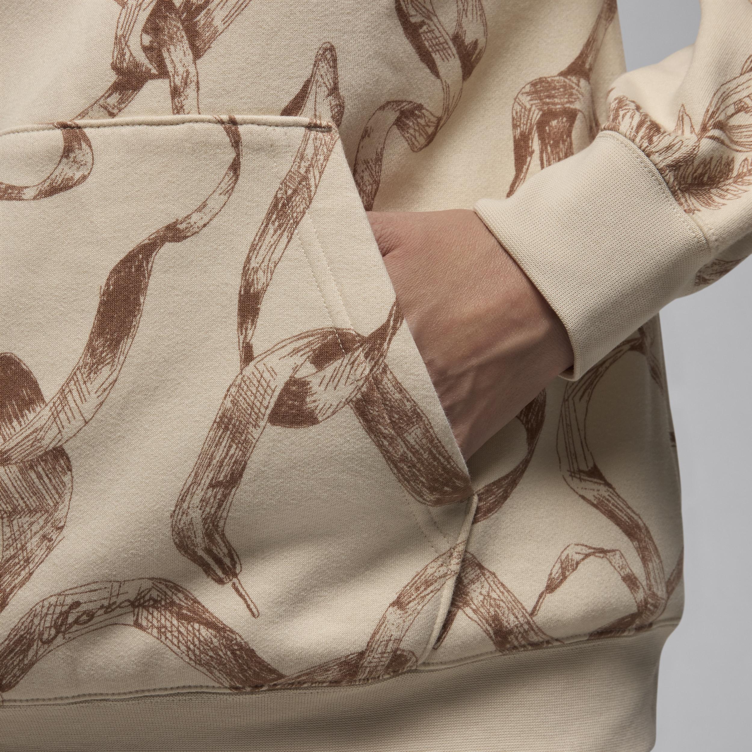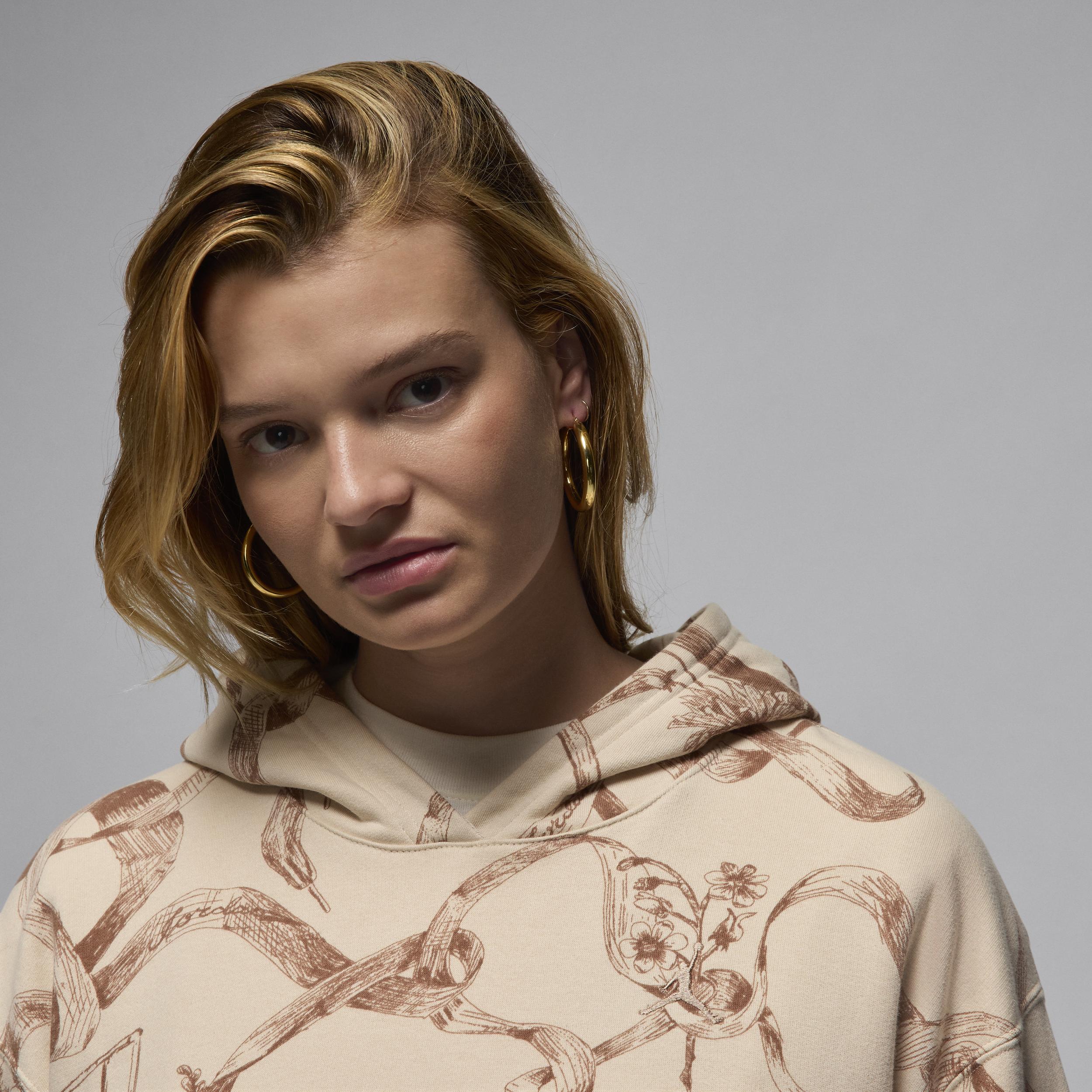 A fresh take on florals, laced up with style only Jordan can bring. Smooth on the outside and brushed soft on the inside, this lightweight fleece hoodie is an easy layer when you want a little extra warmth. A roomy fit with slightly dropped shoulders provides a relaxed look without feeling too big. [] Product Details:Body:76% cotton/24% polyester. Rib:97% cotton/3% spandex. Hood lining:100% cotton. Front pocket. Ribbed cuffs and hem. Machine wash. Imported. Style: HF0440; Color: Legend Light Brown/Legend Medium Brown; Size: S; Gender: Female; Age Group: Adult | Jordan Brooklyn Fleece Women's Printed Pullover in Brown, Size: Small | HF0440-203
