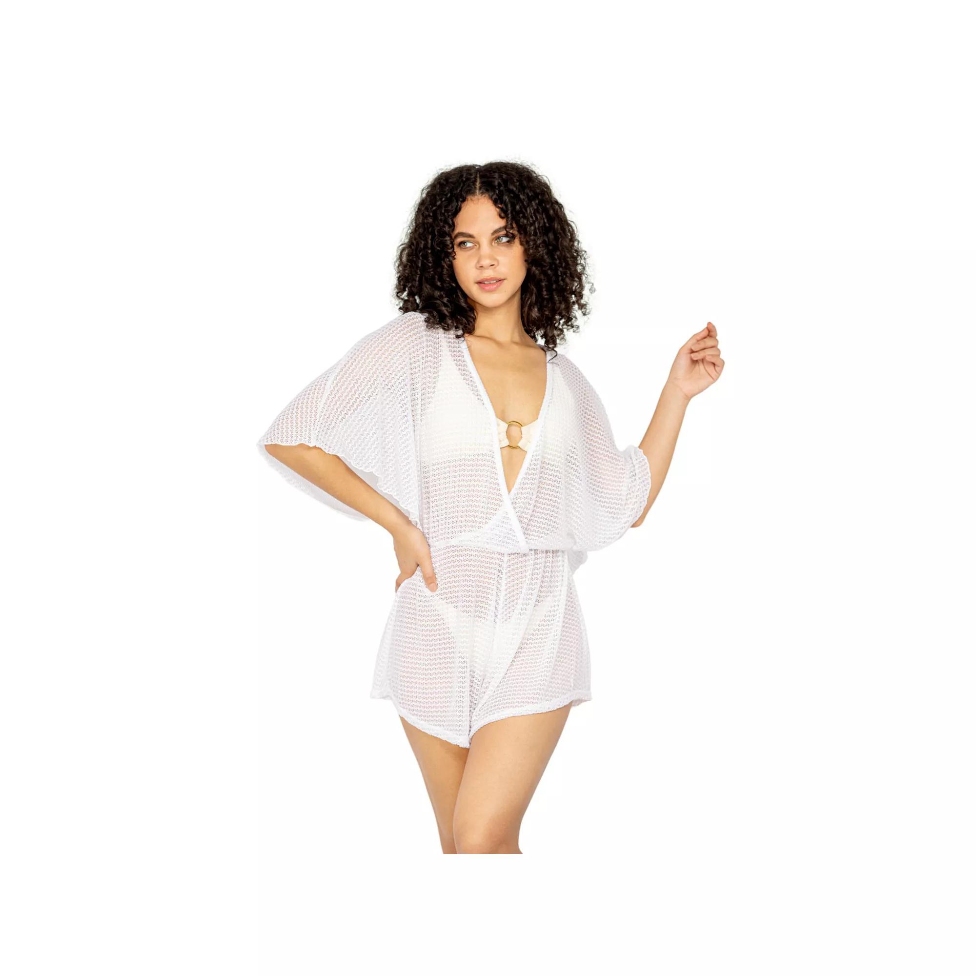 For a laid-back look at the beach or poolside, reach for this women's Jordan Taylor sheer romper swim cover up. Finding the perfect fit and size for women's clothing requires basic measurements of your chest, waist, hips and inseam. Use this guide to learn more about sizing and everything Kohl's has to offer in women's fashion. - https://www.kohls.com/feature/womens-fit-guide.jsp. Sheer mesh design, V-neck, Elbow-length batwing sleeves. FIT & SIZING: Elastic waistband. FABRIC & CARE: Polyester, spandex, Hand wash. Size: Large. Color: White. Gender: female. Age Group: adult. Pattern: Solid. Material: POLY BLEND.