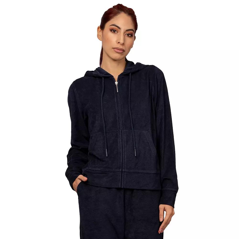 Whether youre lounging poolside or on the couch, youll love the cozy comfort of this womens Jordan Taylor French terry hoodie. Whether youre lounging poolside or on the couch, youll love the cozy comfort of this womens Jordan Taylor French terry hoodie.Finding the perfect fit and size for womens clothing requires basic measurements of your chest, waist, hips and inseam. Use this guide to learn more about sizing and everything Kohls has to offer in womens fashion. Adjustable drawstring hood Zipper font Long sleeves French terry construction 2 pocketsFIT & SIZING 21-in. approximate lengthFABRIC & CARE Cotton, polyester Machine wash Imported Size: Large. Color: Navy. Gender: female. Age Group: adult. Pattern: Solid.