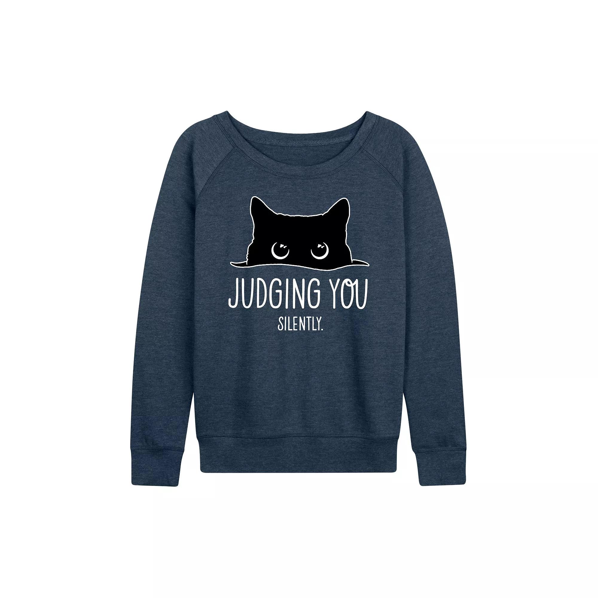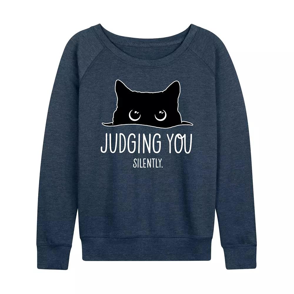 Heather Indigo Judging Silently Pullover - Women, Juniors, Plus & Petite Plus. Expand your lightweight layering options with this French terry pullover featuring a cat lovers graphic and relaxed boatneck.Full graphic text: Judging you silently.Size S: 24 long from high point of shoulder to hemLightweight French terry knit60% cotton / 40% polyesterMachine wash; tumble dryImported, screen printed in the USA