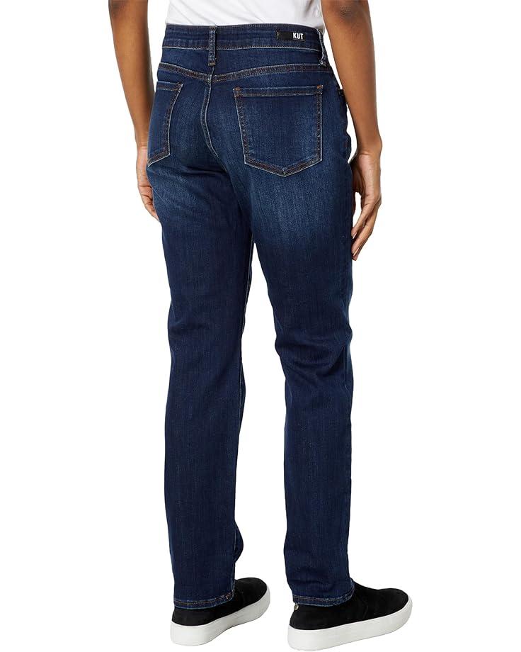 The KUT from the Kloth™ Catherine Boyfriend Jeans in Royal denim has a mid rise and tapered leg. Royal is a whiskered and lightly faded dark indigo blue wash on stretch cotton denim.