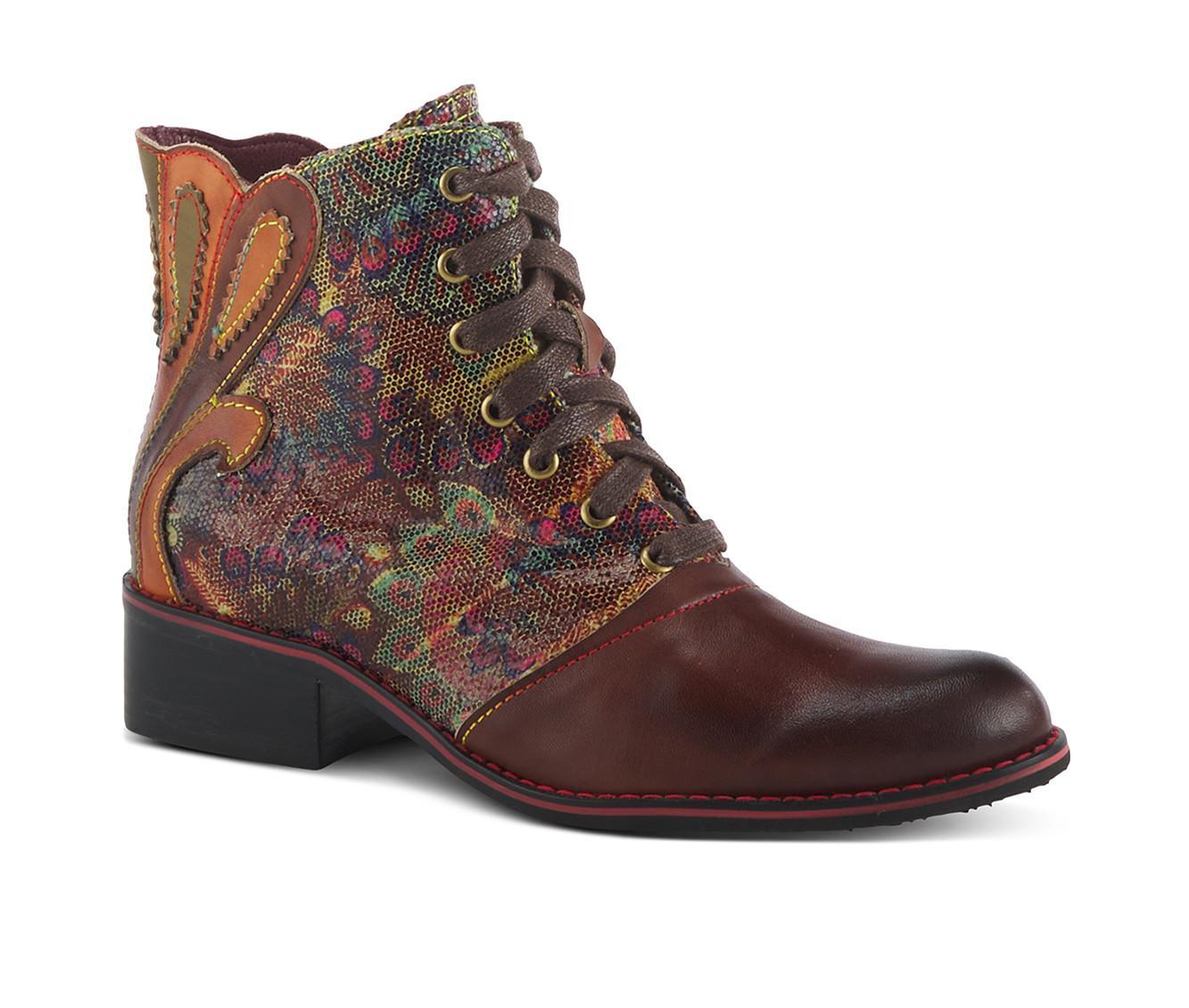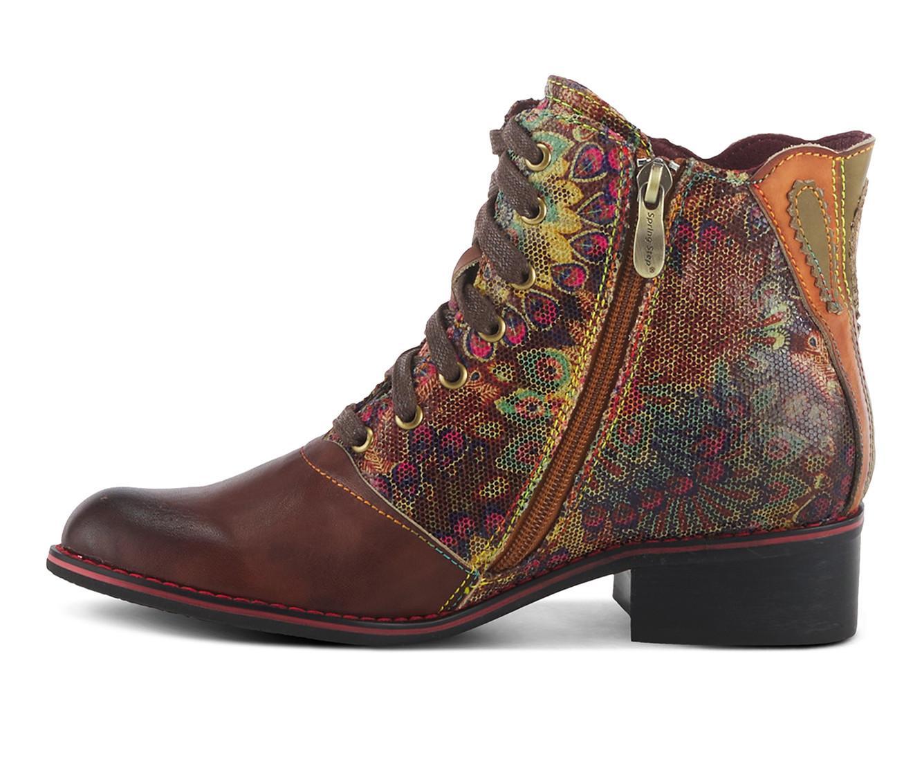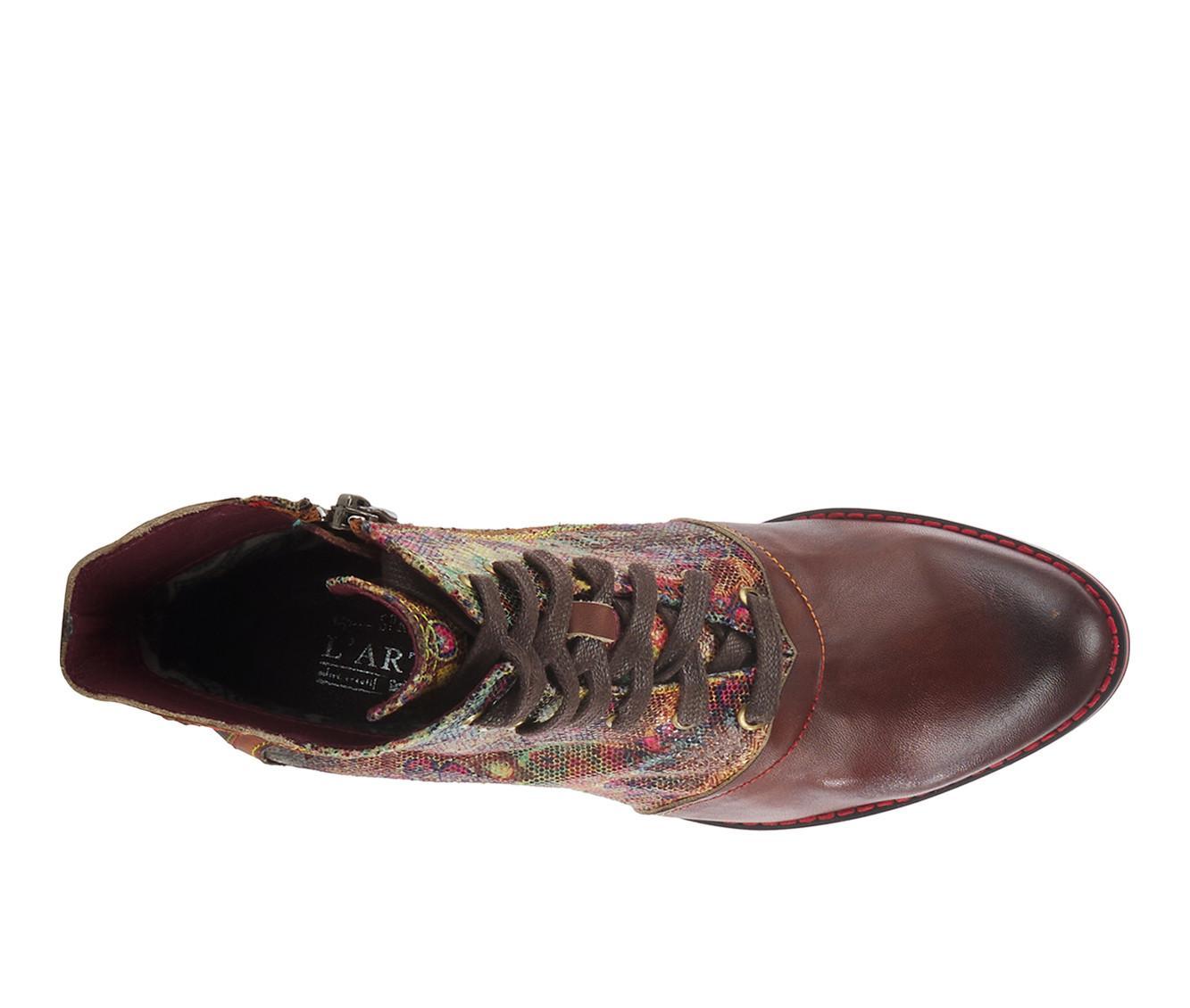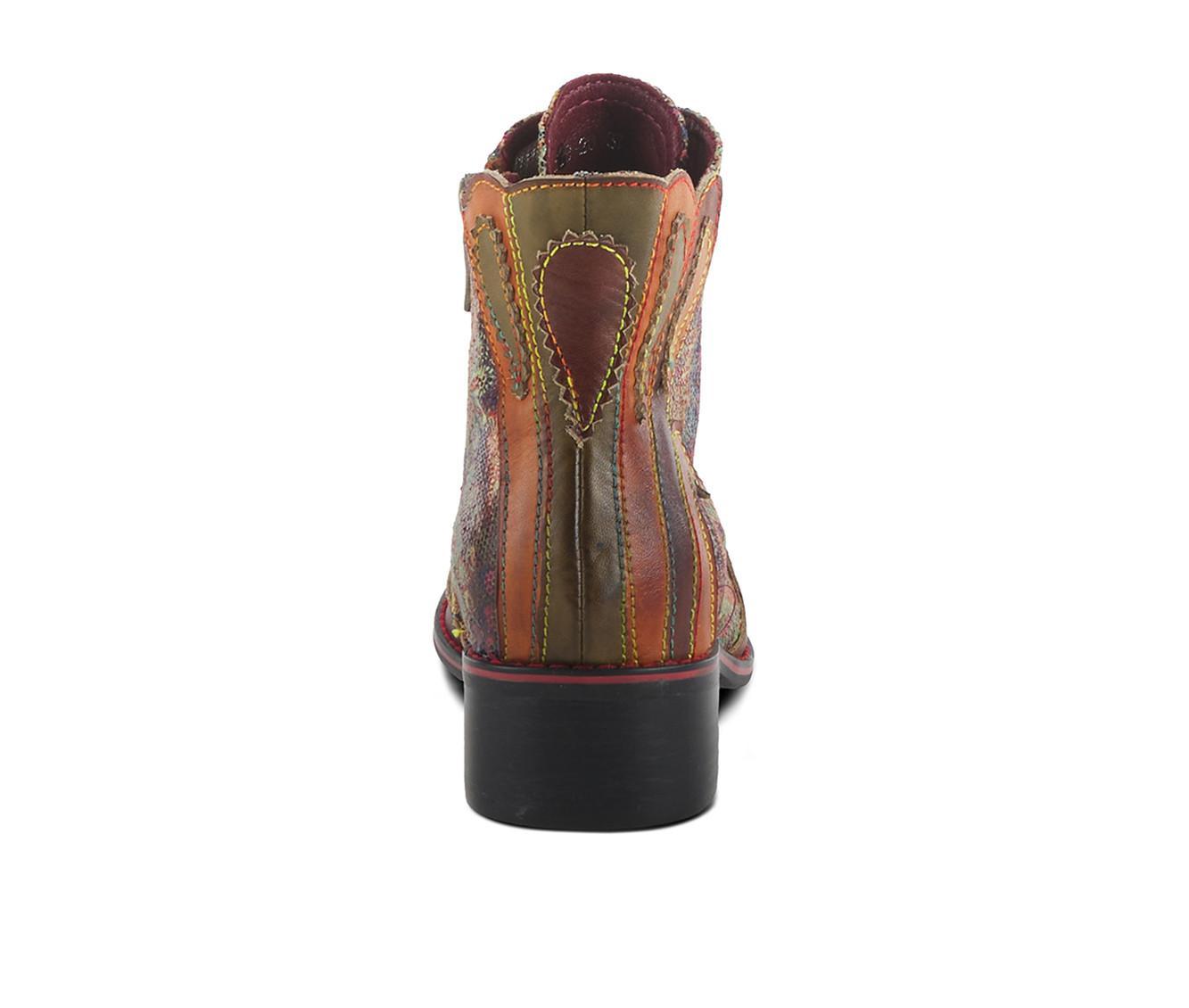 This lace-up and zipper boot combines both style and functionality with its unique design. The back of the shoe features an intricate laser-cut applique design, while the front is brushed and burnished, adding a touch of spice. The iridescent upper and rainbow stitching add a pop of color, making this boot a statement piece that can be dressed up or down.