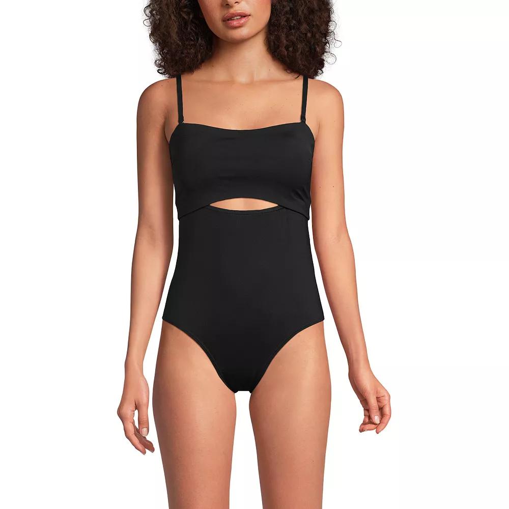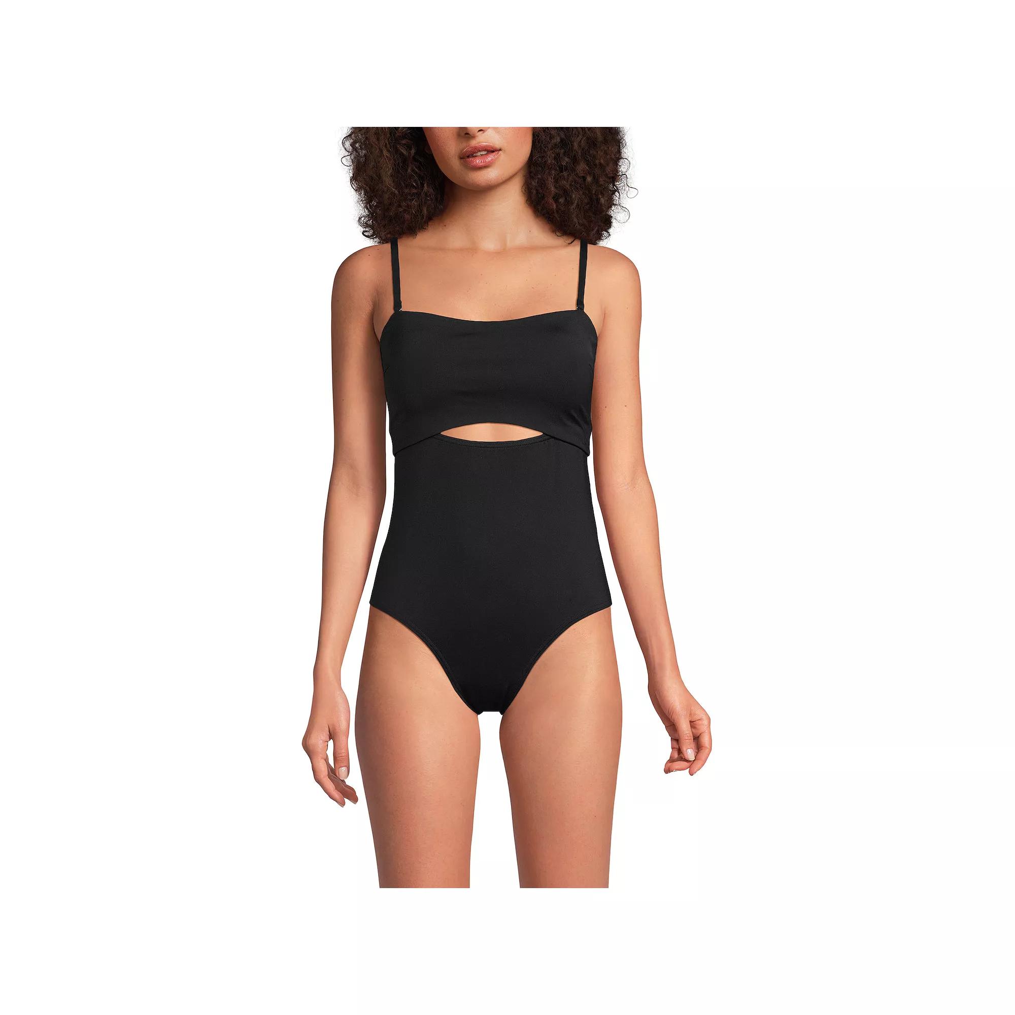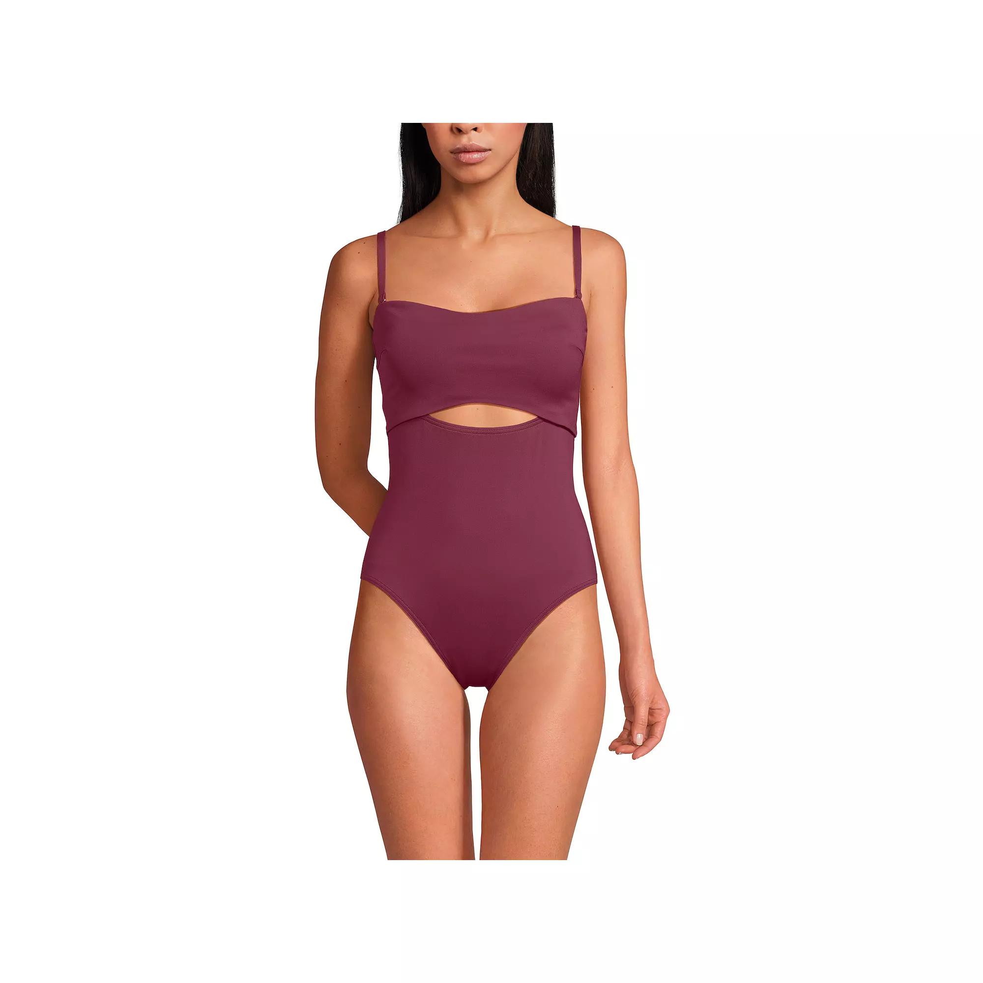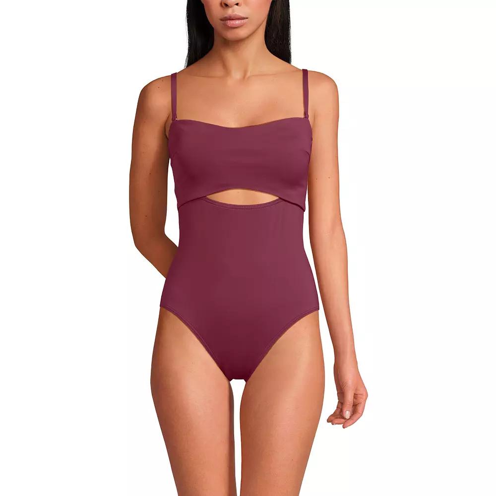 Get ready to turn heads at the beach in this fabulous Lands' End one-piece that combines style with comfort. With its playful cutout, flattering high-leg design, and customizable straps, you'll feel confident and chic whether you're lounging by the pool or taking that unexpected dip in the waves. Click on this WOMEN'S GUIDE to find the perfect fit and more! - https://www.kohls.com/feature/womens-fit-guide.jsp. FEATURES: Boning inside for added structure around the chest, Soft stretchy jersey construction, Cutout below bra hem, Chlorine-resistant spandex, Tummy slimming design, Medium support with sewn-in soft cup bra, Removable, adjustable straps, UPF 50 sun protection. MATERIAL & CARE: Nylon, spandex, Hand wash. DETAILS: Strapless neckline, Sleeveless, Adjustable straps, No closure - pullover styling, Moderate coverage, Imported. Size: Large. Color: Burgundy Spritz. Gender: female. Age Group: adult. Material: NYLON SPANDEX.