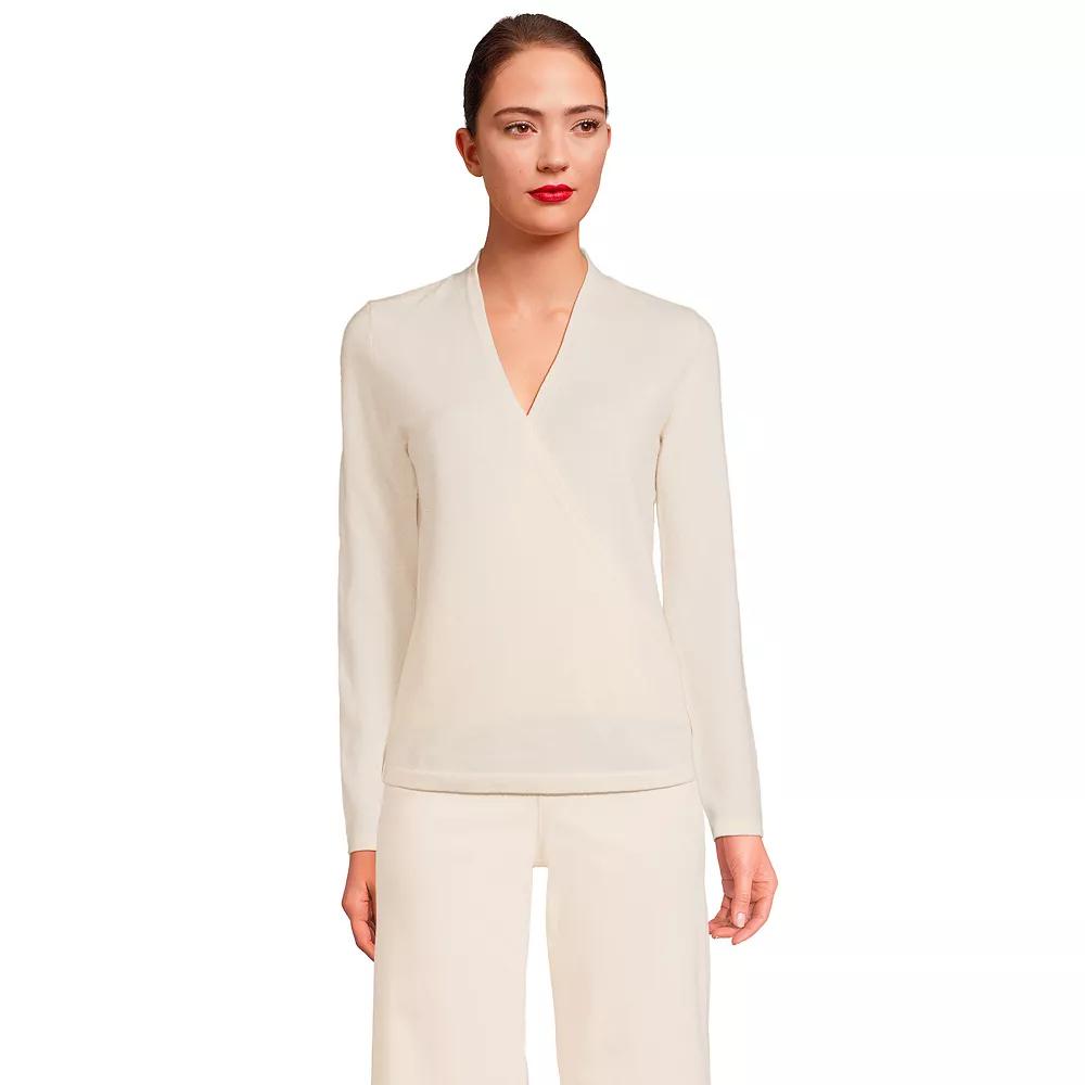 Add a luxe look to your casual wardrobe with this womens Lands End cashmere long sleeve wrap sweater. Click on this WOMENS GUIDE to find the perfect fit and more! Add a luxe look to your casual wardrobe with this womens Lands End cashmere long sleeve wrap sweater. Click on this WOMENS GUIDE to find the perfect fit and more! FEATURES Inner Mongolian 2-ply cashmere feels softer over time Faux wrap design Straight hem Elastic cuffs Long sleeves V-neckFIT & SIZING Straight fit 24-in. length from shoulder to hemFABRIC & CARE Cashmere Hand wash Imported Size: Small. Color: Black. Gender: female. Age Group: adult.