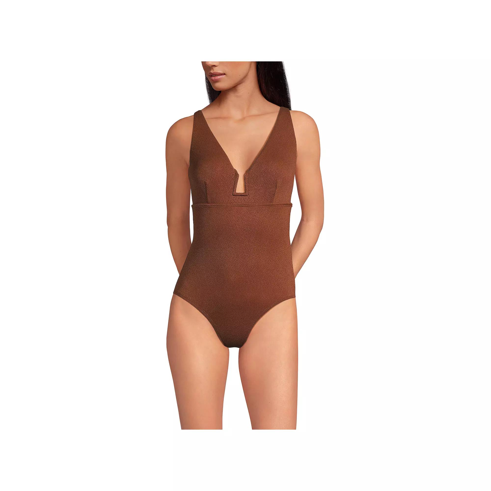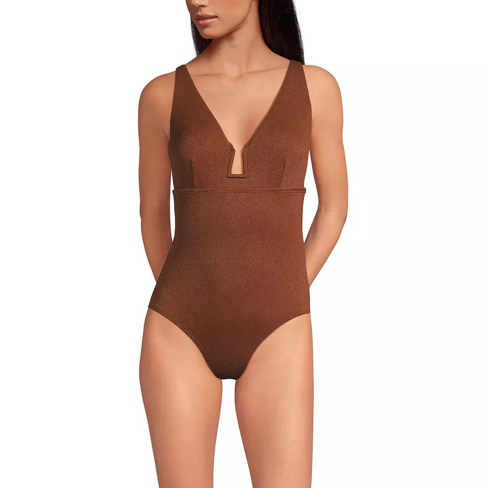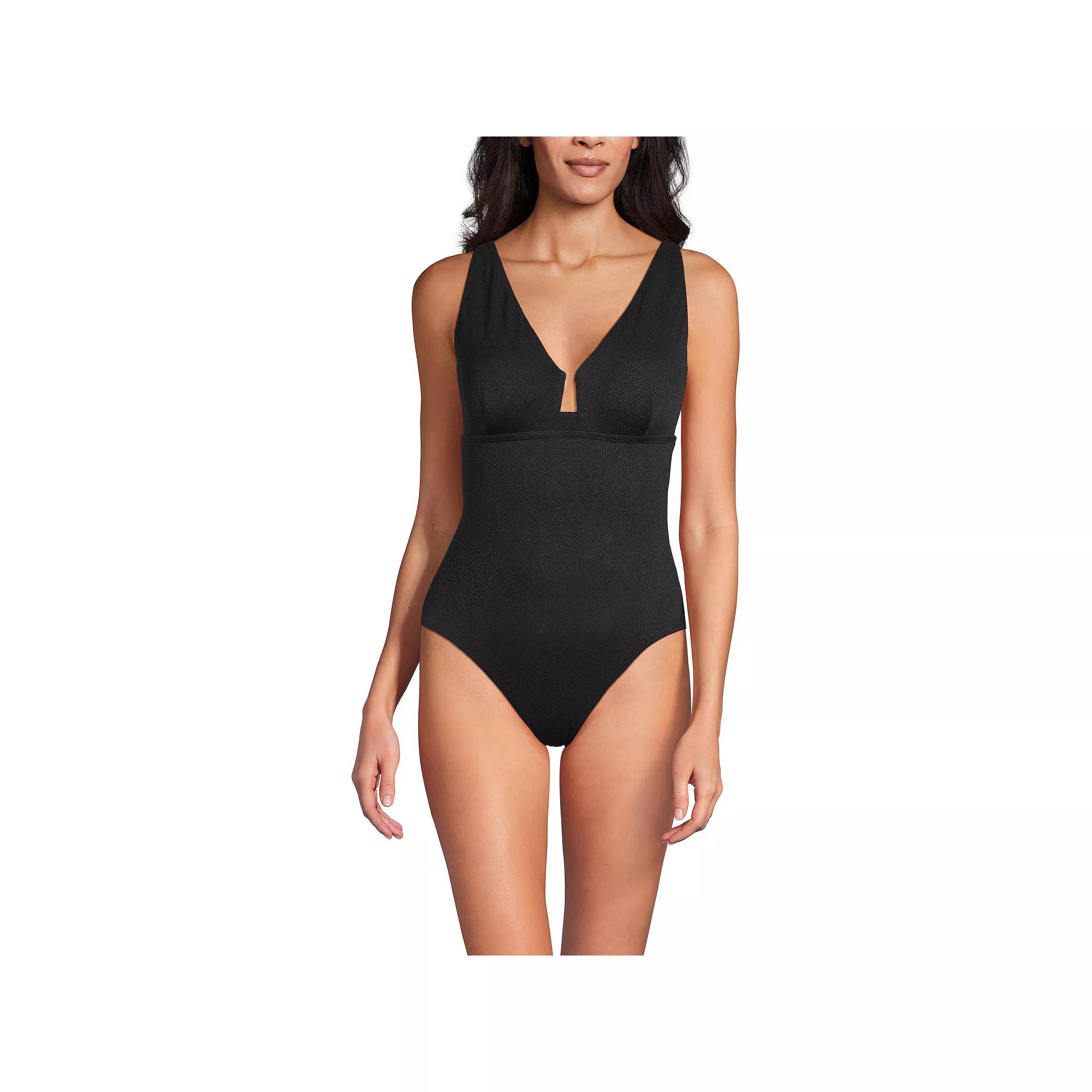 Get ready to turn heads by the poolside in this Lands' End one-piece that perfectly balances style and comfort. With its crepe-like texture and elegant rectangular wire detail at the bust, plus adjustable straps and a high leg opening that elongates your silhouette, this swimsuit is your new go-to for sun-soaked adventures and confident dips into the water. Click on this WOMEN'S GUIDE to find the perfect fit and more! - https://www.kohls.com/feature/womens-fit-guide.jsp. FEATURES: Adjustable straps for a customized fit, Crepe-like fabric adds texture, Rectangular wire detail at the bust, Chlorine-resistant spandex, Tummy slimming design, Medium support bra with removable soft cups, UPF 50 sun protection. MATERIAL & CARE: Nylon, spandex, Hand wash. DETAILS: V-neck, Sleeveless, Adjustable straps, No closure - pullover styling, Moderate coverage, Imported. Size: X Small. Color: Black. Gender: female. Age Group: adult. Material: NYLON SPANDEX.
