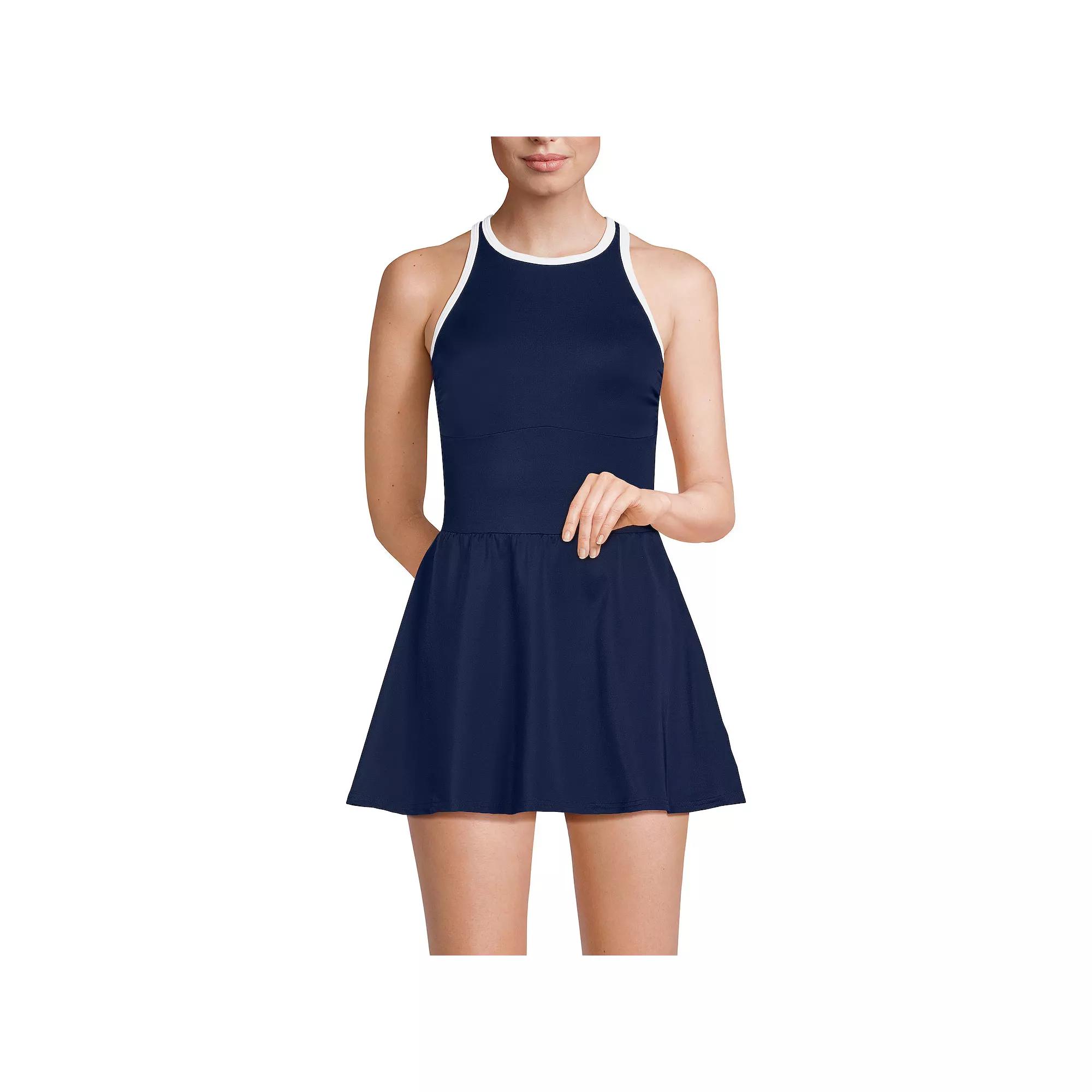 Dive into summer fun with this Lands' End swimsuit that’s all about comfort and style. The high neck offers extra coverage, while the chic crisscross back detail gives it a playful vibe, complete with pockets for those beachside essentials—because who doesn't love a swimsuit that can hold their sunscreen? Click on this WOMEN'S GUIDE to find the perfect fit and more! - https://www.kohls.com/feature/womens-fit-guide.jsp. FEATURES: High neck for more coverage, Crisscross back detail adds a touch of style, Built-in Tugless one-piece for coverage, On-seam pockets, Chlorine-resistant spandex, Fabric provides UPF 50 sun protection, Bust minimizer, Sewn-in soft cup bra, 3% of all 3BRAND revenue is donated to the Why Not You Foundation, a nonprofit organization founded by Russell and Ciara in 2014 dedicated to fighting poverty through education, empowering youth to lead with a why not you attitude. FIT & SIZE: Fits up to a DD-cup size. MATERIAL & CARE: Body: nylon, spandex, Lining: polyester, spandex, Hand wash. DETAILS: No closure - pullover styling, Adjustable straps, Moderate coverage, High neckline, Sleeveless, Imported. WARNING: Cancer and Reproductive Harm - WARNING Reproductive Harm www.P65Warnings.ca.gov - https://www.p65warnings.ca.gov/. Size: 14 Dd. Color: Deep Navy White. Gender: female. Age Group: adult. Material: POLYESTER SPANDEX.