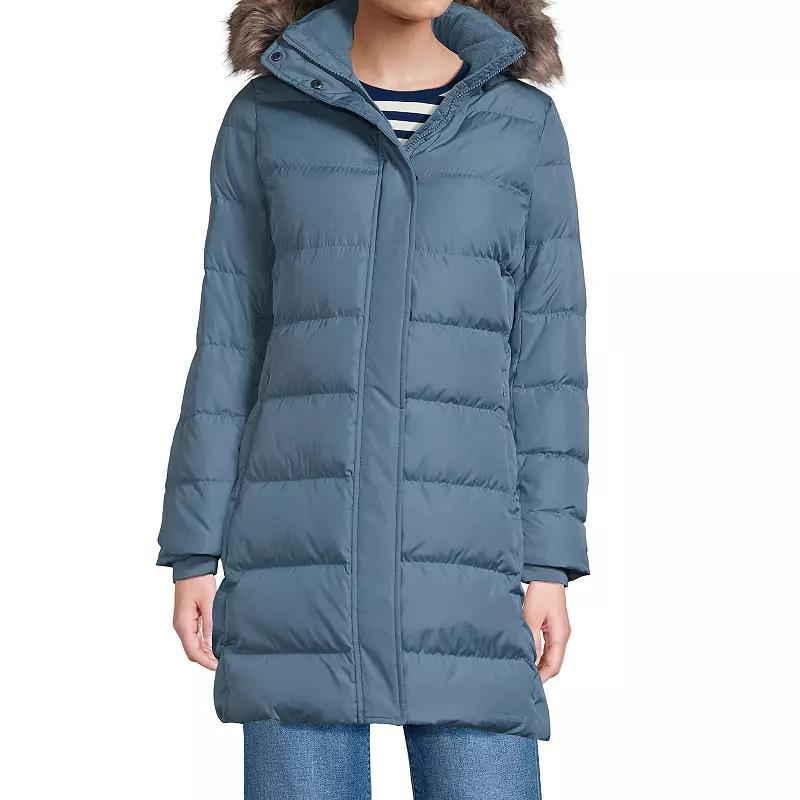You'll love the cozy style of this women's Down Winter Coat from Lands' End. Click on this WOMEN'S GUIDE to find the perfect fit and more! - https://www.kohls.com/feature/womens-fit-guide.jsp. FEATURES: Water-resistant technology, Woven construction, Removable hood with removable faux-fur trim, Snap & zipper closure, Long sleeves, Elastic cuffs, 1 interior snap pocket, 2 inseam pockets with invisible zippers, Fully lined. FIT & SIZING: Midweight warmth rating, Classic fit, 33-in. length from shoulder to hem, Designed to hit above the knees. FABRIC & CARE: Shell: nylon, polyester, Fill: down, feathers, Lining: polyester, Machine wash, Trim: hand wash, Imported. RESPONSIBLE Responsible Down Standard Certified. Size: X Small. Color: Soft Peacock. Gender: female. Age Group: adult. Material: OTHER MATERIAL.