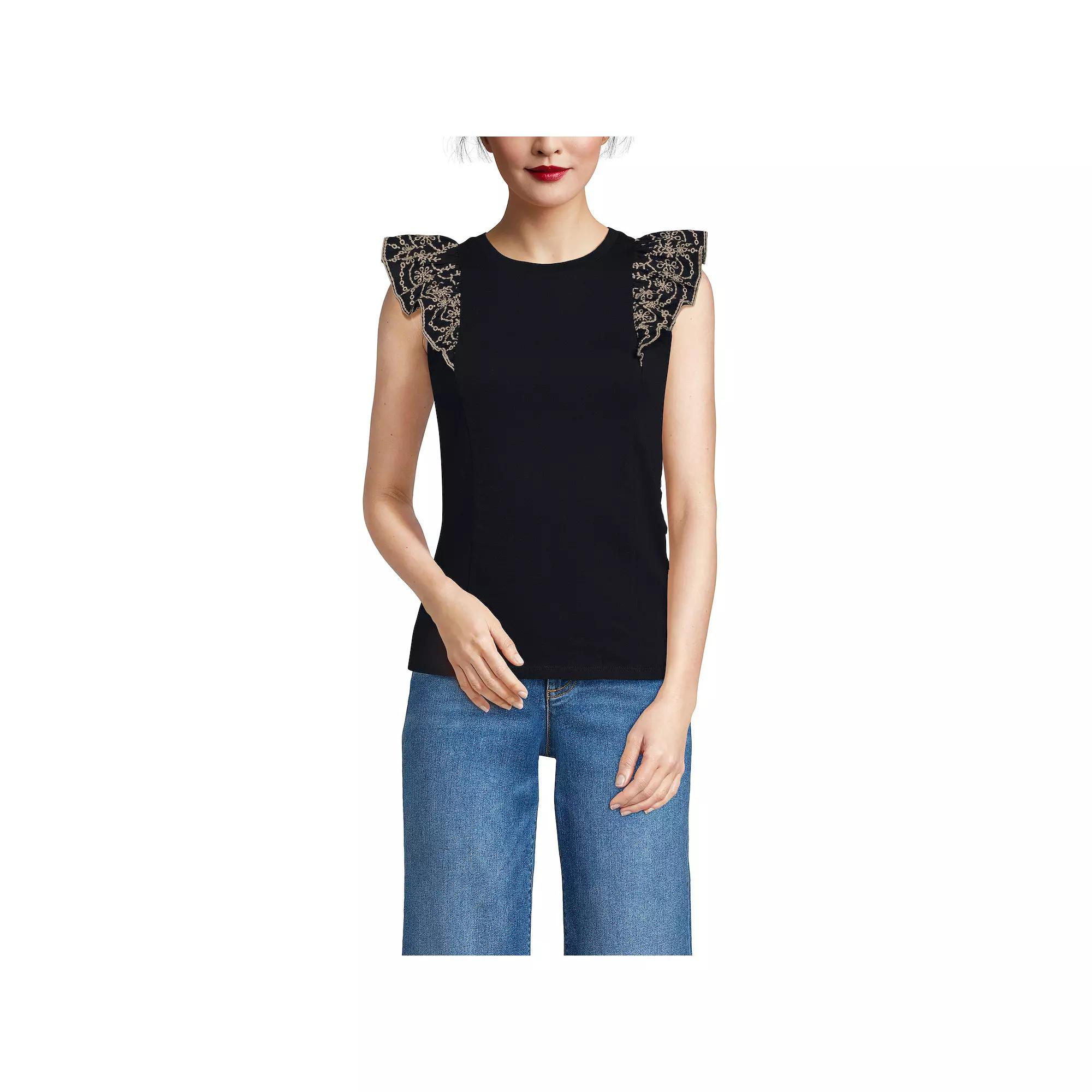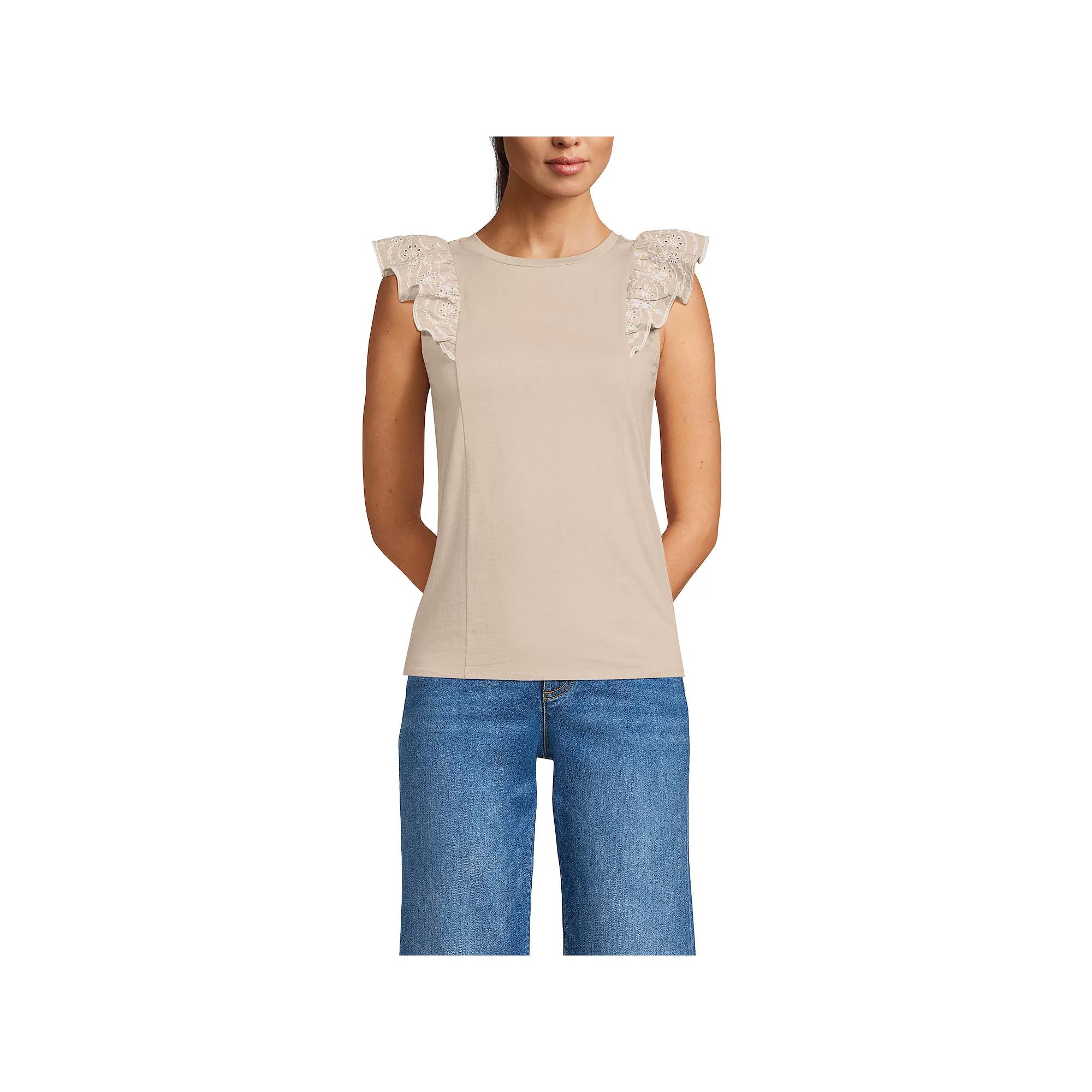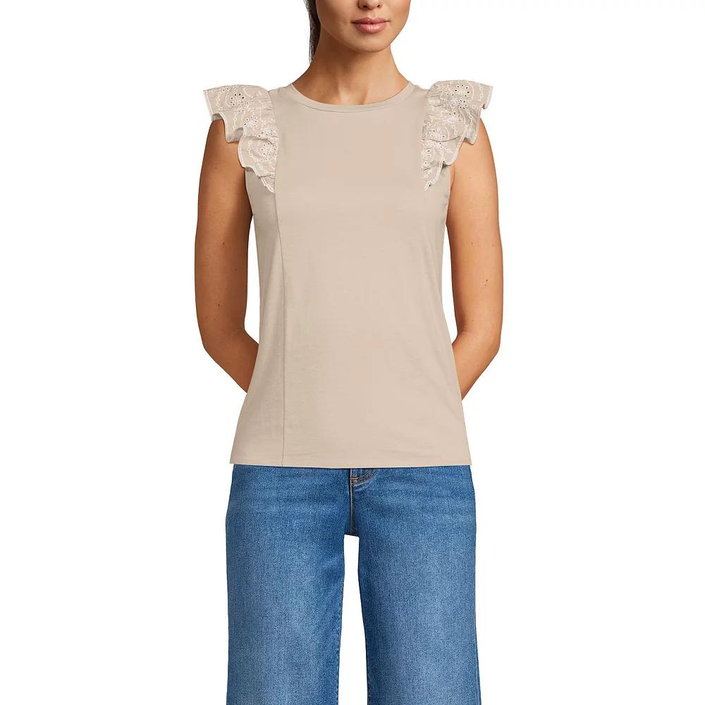 Elevate your casual wardrobe with this charming tank from Lands End, featuring playful embroidered ruffles at the armholes for a touch of feminine flair. Perfect for everything from relaxed home days to casual outings, it layers effortlessly under a cardigan or pairs beautifully with shorts, making it a versatile staple for any occasion.Click on this WOMENS GUIDE to find the perfect fit and more!Elevate your casual wardrobe with this charming tank from Lands End, featuring playful embroidered ruffles at the armholes for a touch of feminine flair. Perfect for everything from relaxed home days to casual outings, it layers effortlessly under a cardigan or pairs beautifully with shorts, making it a versatile staple for any occasion.Click on this WOMENS GUIDE to find the perfect fit and more!FEATURES Crewneck Sleeveless Straight hem Pullover stylingFIT & SIZING Relaxed fit 28-in. length from shoulder to hemFABRIC & CARE Cotton Machine wash Imported Size: Small. Color: Champagne. Gender: female. Age Group: adult.