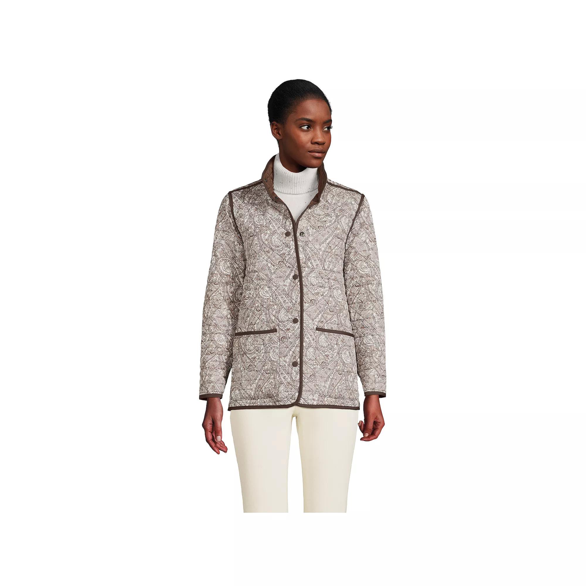 Double your winter wardrobe with this insulated womens Lands End reversible barn coat. Two cozy looks in one!Click on this WOMENS GUIDE to find the perfect fit and more! Double your winter wardrobe with this insulated womens Lands End reversible barn coat. Two cozy looks in one! Click on this WOMENS GUIDE to find the perfect fit and more! FEATURES TEMPERATURE RATING: +21 to +42 Fahrenheit Reversible design solid on one side, and patterned on the other Water-resistant shell on both sides Snap closure on both sides Full stand collar Two front patch pockets on both sides Long sleeves with elastic cuffs Fully linedFIT & SIZING Classic fit 27-in. length from shoulder to hem Designed to hit just below the waist LightweightFABRIC & CARE Polyester Machine wash Imported Size: L Petite. Color: Brown. Gender: female. Age Group: adult.
