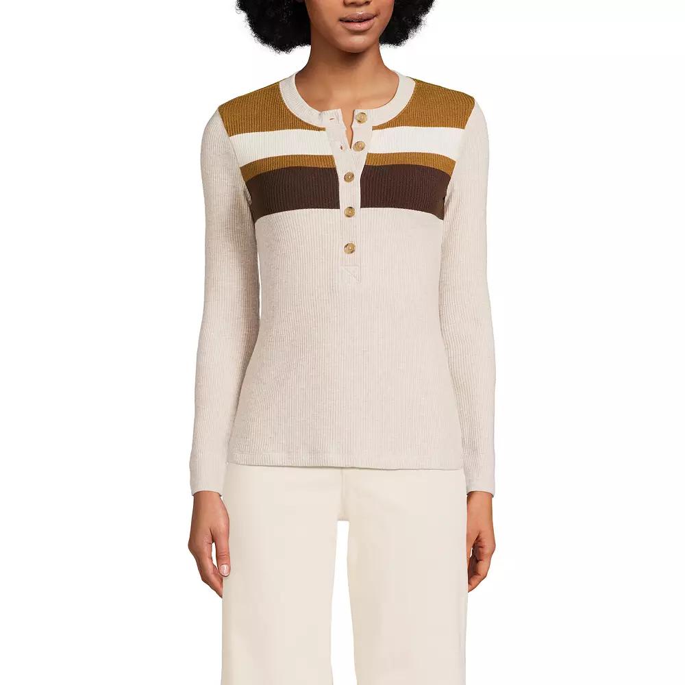 You'll love the way you look in this women's henley top from Lands' End.Click on this WOMEN'S GUIDE to find the perfect fit and more!You'll love the way you look in this women's henley top from Lands' End.Click on this WOMEN'S GUIDE to find the perfect fit and more!FEATURES Scoopneck Long sleeves Rib knit constructionFIT & SIZING 24-in. length from shoulder to hem Button front closureFABRIC & CARE Viscose, polyester, nylon, spandex Machine wash Imported Size: Medium. Color: Coriander Stripe. Gender: female. Age Group: adult.