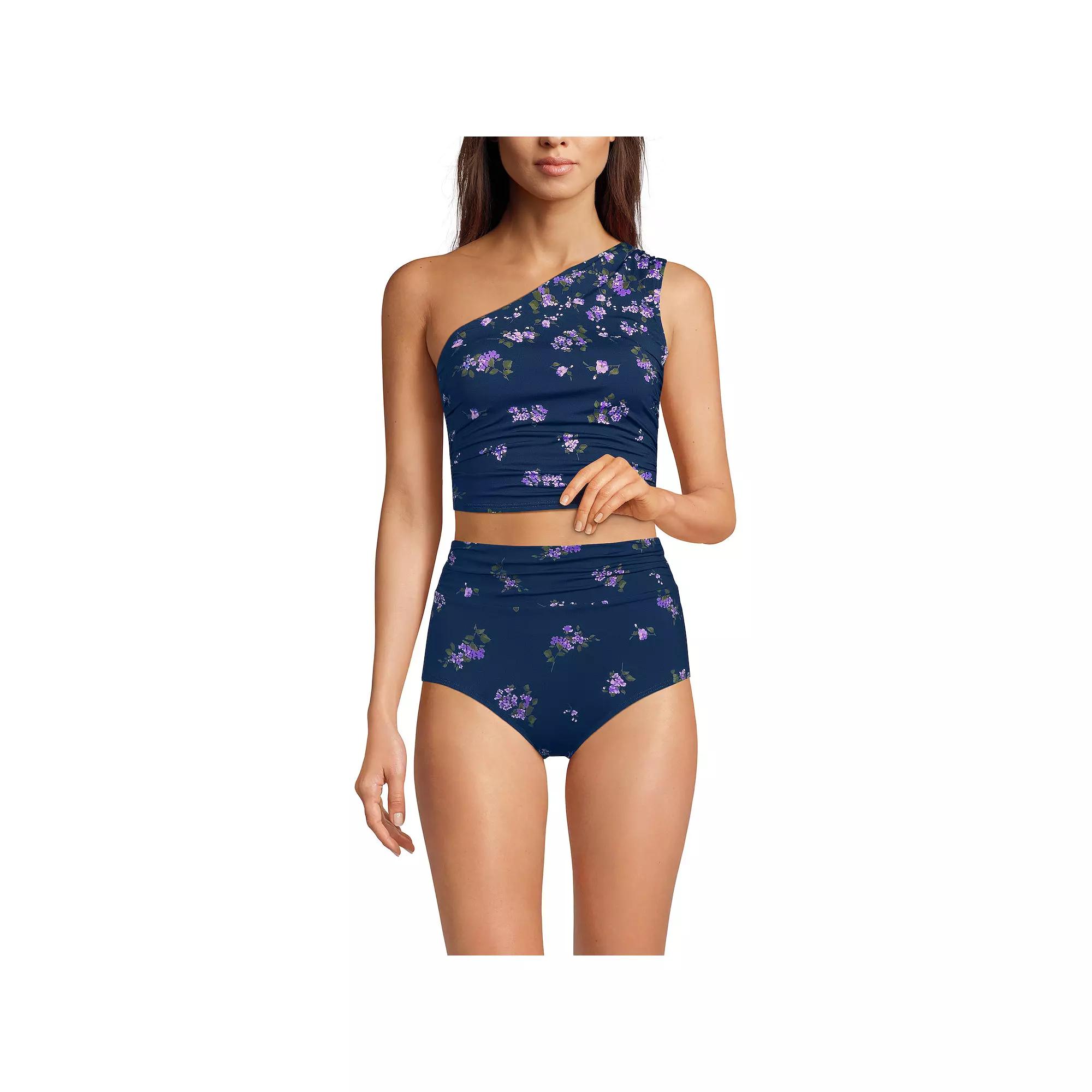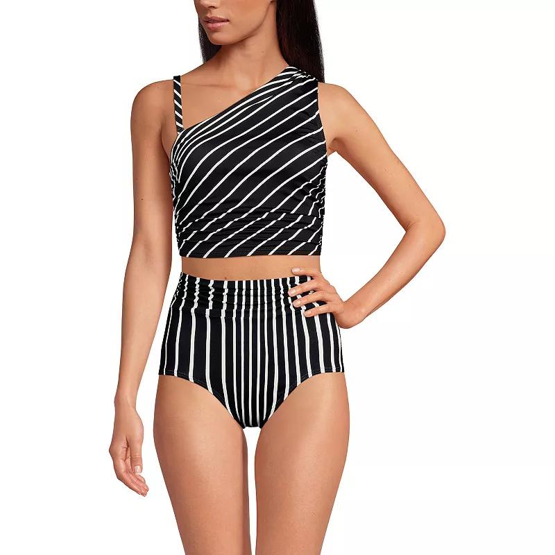 Elevate your beach style with this chic one-shoulder swim top from Lands' End, designed to effortlessly flatter your figure. The trendy cropped length and ruching details provide a sophisticated silhouette, while the adjustable shoulder strap allows you to customize your fit, making it perfect for sunbathing, swimming, or pairing with your favorite bottoms. Click on this WOMEN'S GUIDE to find the perfect fit and more! - https://www.kohls.com/feature/womens-fit-guide.jsp. FEATURES: No closure - pullover styling, One shoulder style with additional removable shoulder strap, Sewn-in soft bra cups, Moderate coverage, Bust and waist minimizer, UPF 50 sun protection, Ruching detail gives you flattering ease, Durable spandex resists breakdown from chlorine, sunscreen and sweat to lasts longer than suits made with ordinary spandex, Unlined, Lined gusset. FIT & SIZING: This is a high-compression swimsuit; for a more comfortable fit, size up, Cropped in length, designed to hit above the belly button, Fits up to a DDD-cup size, Available in long torso, Mix tops and bottoms (sold separately) to suit your style, Combine sizes for a perfect fit. FABRIC & CARE: Nylon, spandex, Gusset lining: nylon, spandex, Hand wash, Imported,. WARNING: Cancer and Reproductive Harm - www.P65Warnings.ca.gov - https://www.p65warnings.ca.gov/. Size: 18. Color: Black Egret Stripe. Gender: female. Age Group: adult. Material: NYLON SPANDEX.