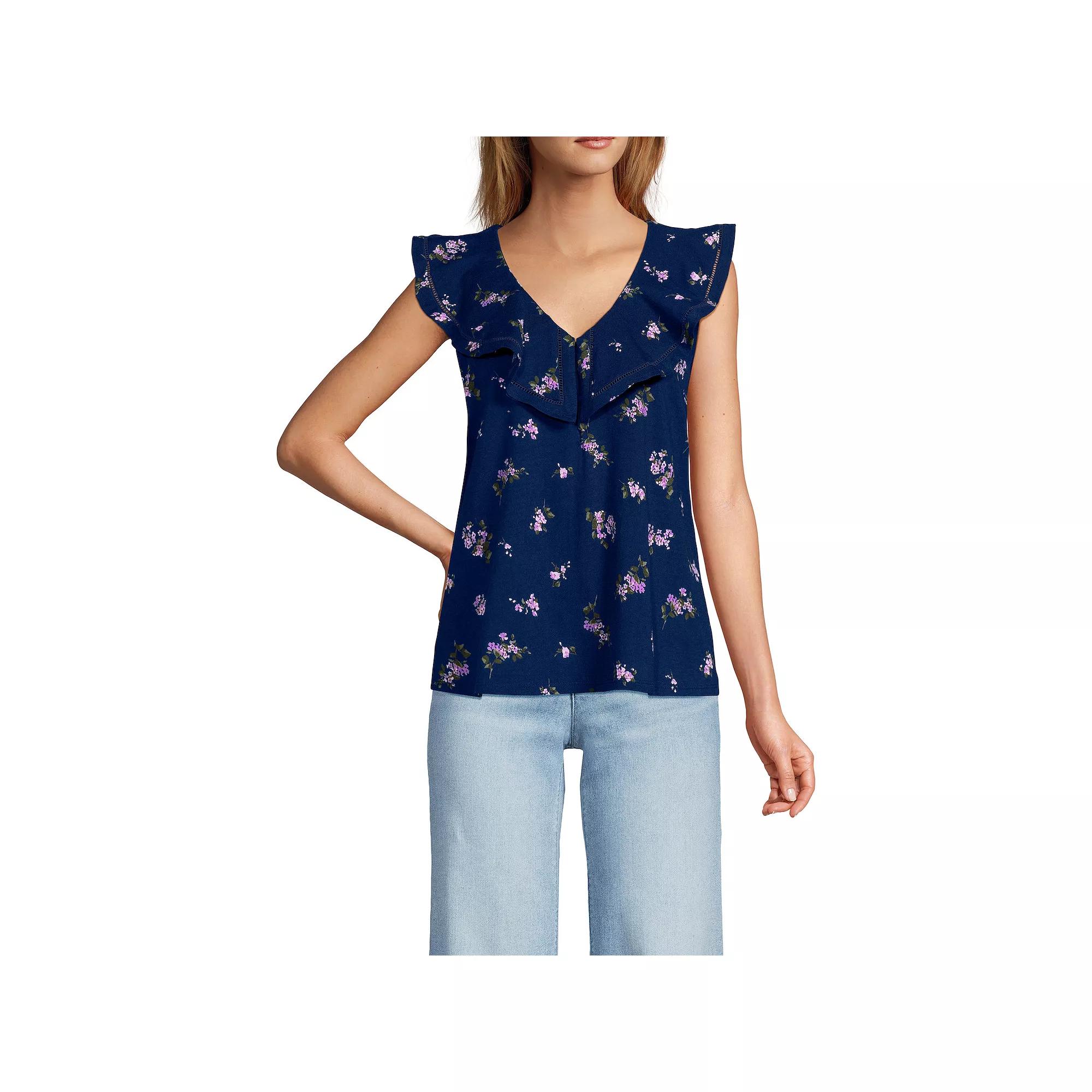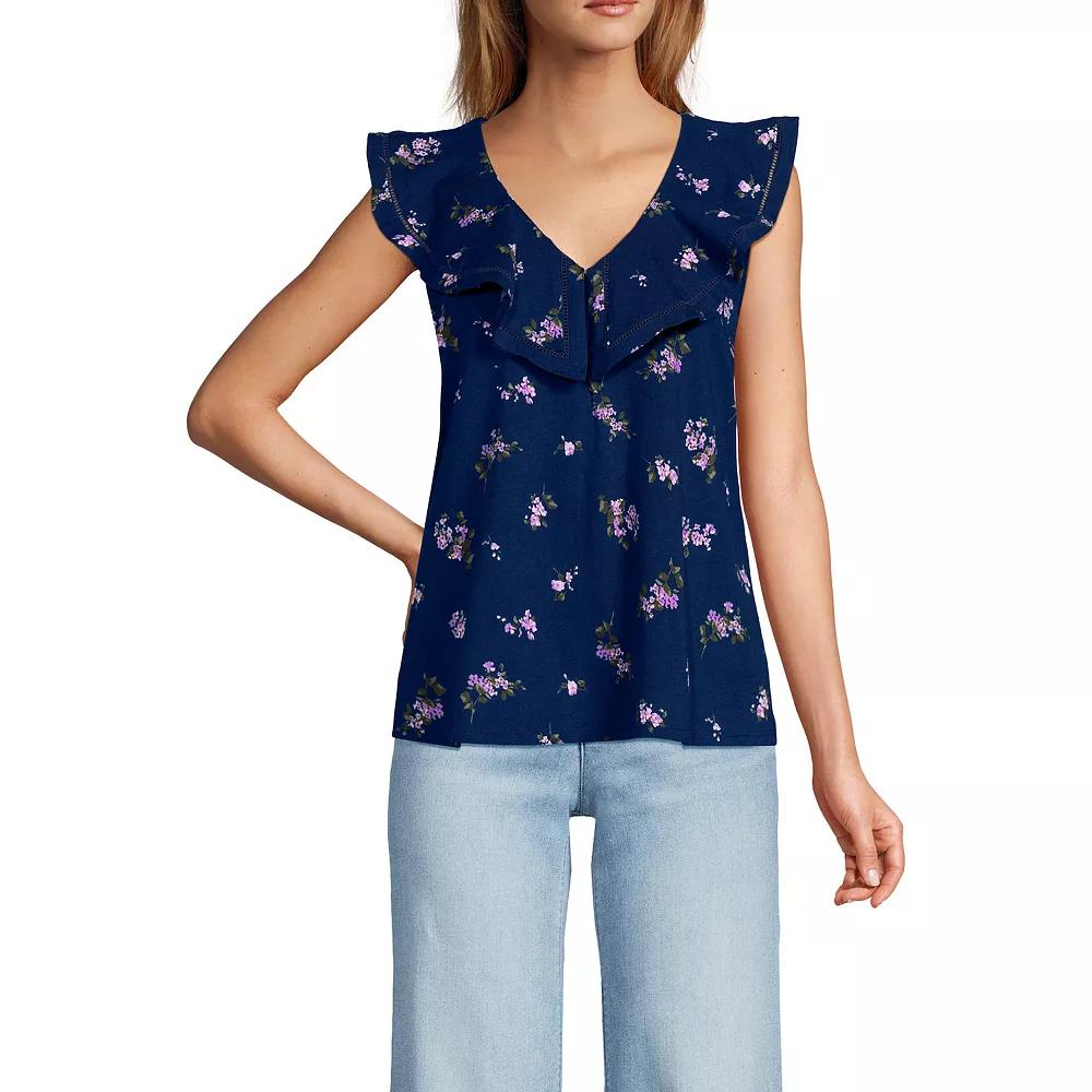 Elevate your everyday style with this chic top from Lands' End, featuring a feminine ruffled V-neckline and a flowy, relaxed fit that falls gracefully to the high hip. Perfect for pairing with dress pants, skirts, or your favorite jeans, this versatile piece effortlessly combines comfort and elegance, making it a must-have addition to your wardrobe.Click on this WOMEN'S GUIDE to find the perfect fit and more!Elevate your everyday style with this chic top from Lands' End, featuring a feminine ruffled V-neckline and a flowy, relaxed fit that falls gracefully to the high hip. Perfect for pairing with dress pants, skirts, or your favorite jeans, this versatile piece effortlessly combines comfort and elegance, making it a must-have addition to your wardrobe.Click on this WOMEN'S GUIDE to find the perfect fit and more!FEATURES V-neck Sleeveless Ruffle sleeves Straight hem Pullover stylingFIT & SIZING Relaxed fit 28-in. length from shoulder to hemFABRIC & CARE Cotton Machine wash Imported Size: Small. Color: Deep Navy Bouquet. Gender: female. Age Group: adult.