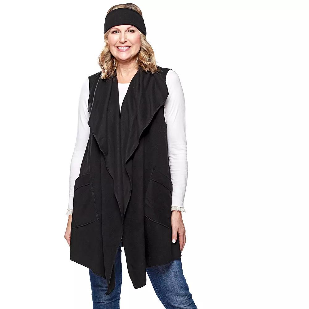 Women's Le Moda Solid Knit Fleece Vest with Matching Headband, Black