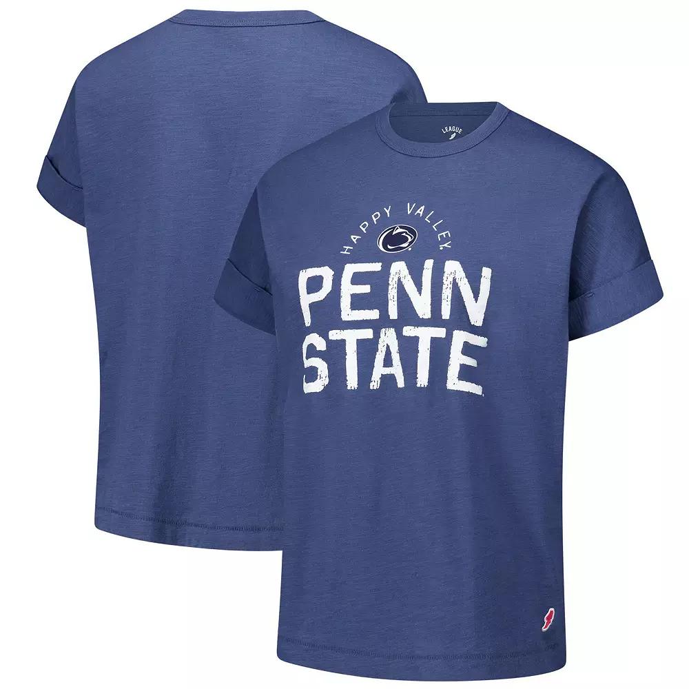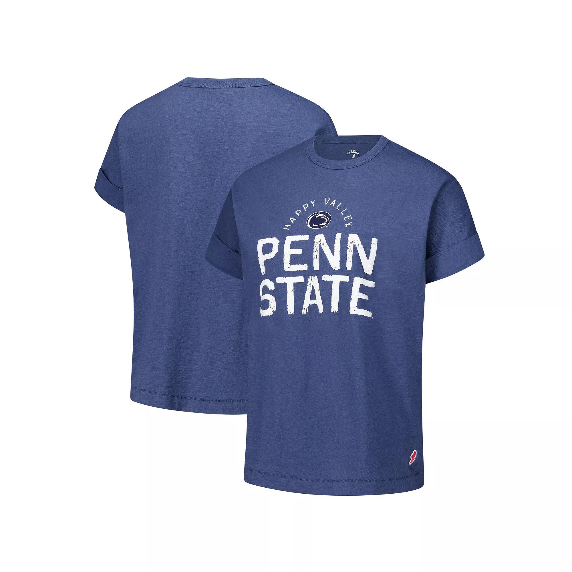 Embrace effortless style while repping your Penn State Nittany Lions pride with this League Collegiate Wear Slub Rolled Cuff T-Shirt. Its relaxed, boxy fit and dolman sleeves offer plenty of room to move, while the slub fabric adds a touch of texture and visual interest. With distressed screen print graphics across the front, this tee proudly showcases your Penn State pride.Embrace effortless style while repping your Penn State Nittany Lions pride with this League Collegiate Wear Slub Rolled Cuff T-Shirt. Its relaxed, boxy fit and dolman sleeves offer plenty of room to move, while the slub fabric adds a touch of texture and visual interest. With distressed screen print graphics across the front, this tee proudly showcases your Penn State pride.PRODUCT FEATURESMaterial: 100% CottonShort sleeveHem with side splitsImportedMachine wash, tumble dry lowDistressed screen print graphics across frontOfficially licensedSlub fabricBrand: League Collegiate WearBoxy fit for a relaxed feel and freedom of movementDolman sleeves with rolled cuffs Color: Navy. Gender: female. Age Group: adult.