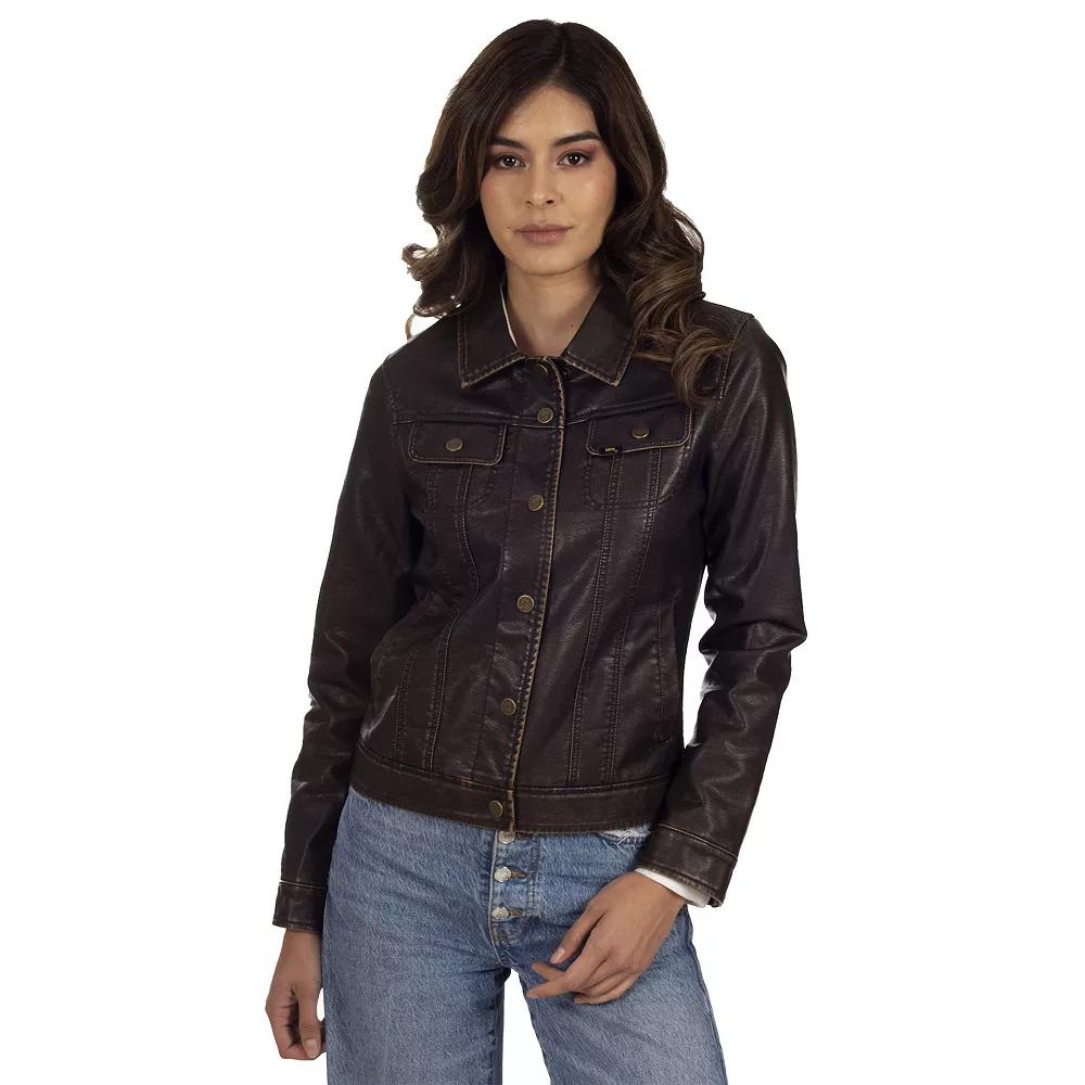 Classic jean jacket styling and a faux-leather finish make this women's lee jacket a great wardrobe choice. Classic jean jacket styling and a faux-leather finish make this women's lee jacket a great wardrobe choice. Button front Long sleeves Faux-leather construction 4 pockets No HoodFIT & SIZING Designed to hit just below the waist Adjustable waist tabs MidweightFABRIC & CARE Polyurethane Dry clean Imported Size: X Large. Color: Brown. Gender: female. Age Group: adult.