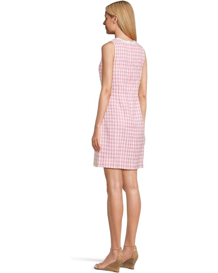 Donne a cute look for the next party or special occasion with Lilly Pulitzer® Aria Boucle Shift Dress. The fitted, bra-friendly shift dress features a notch neckline with contrast trim, a front bow detail, an allover checkered print, a sleeveless design, and an above-the-knee silhouette.