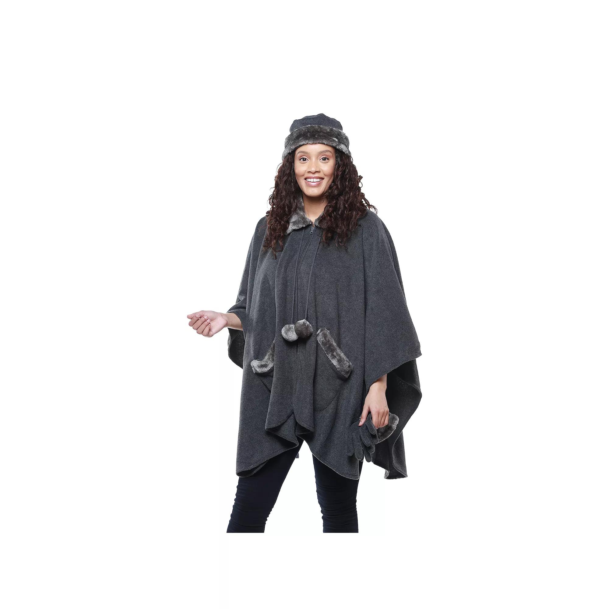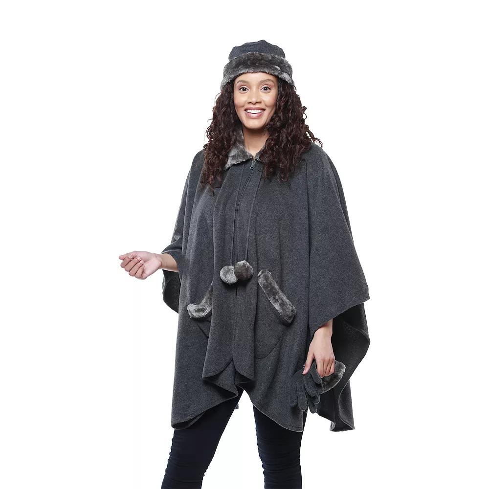 This fun poncho with button detail and matching pocket gloves makes for a great extra layer for going out and about or home curling up with a book. This fun poncho with button detail and matching pocket gloves makes for a great extra layer for going out and about or home curling up with a book. Includes: poncho, matching gloves Single-layer midweight fleece No sleeves for extra mobility Faux fur trim on collar, pocket, and gloves 2 pockets Pom detailsFIT & SIZING 41.5 W x 36.5 L One size fits mostFABRIC & CARE Polyester Machine wash Imported Color: Grey. Gender: female. Age Group: adult.