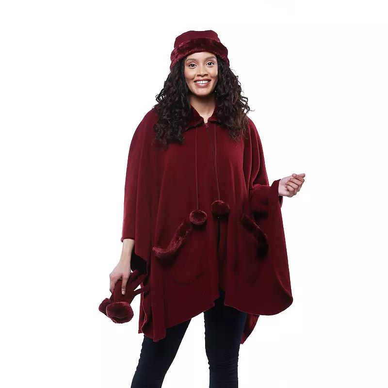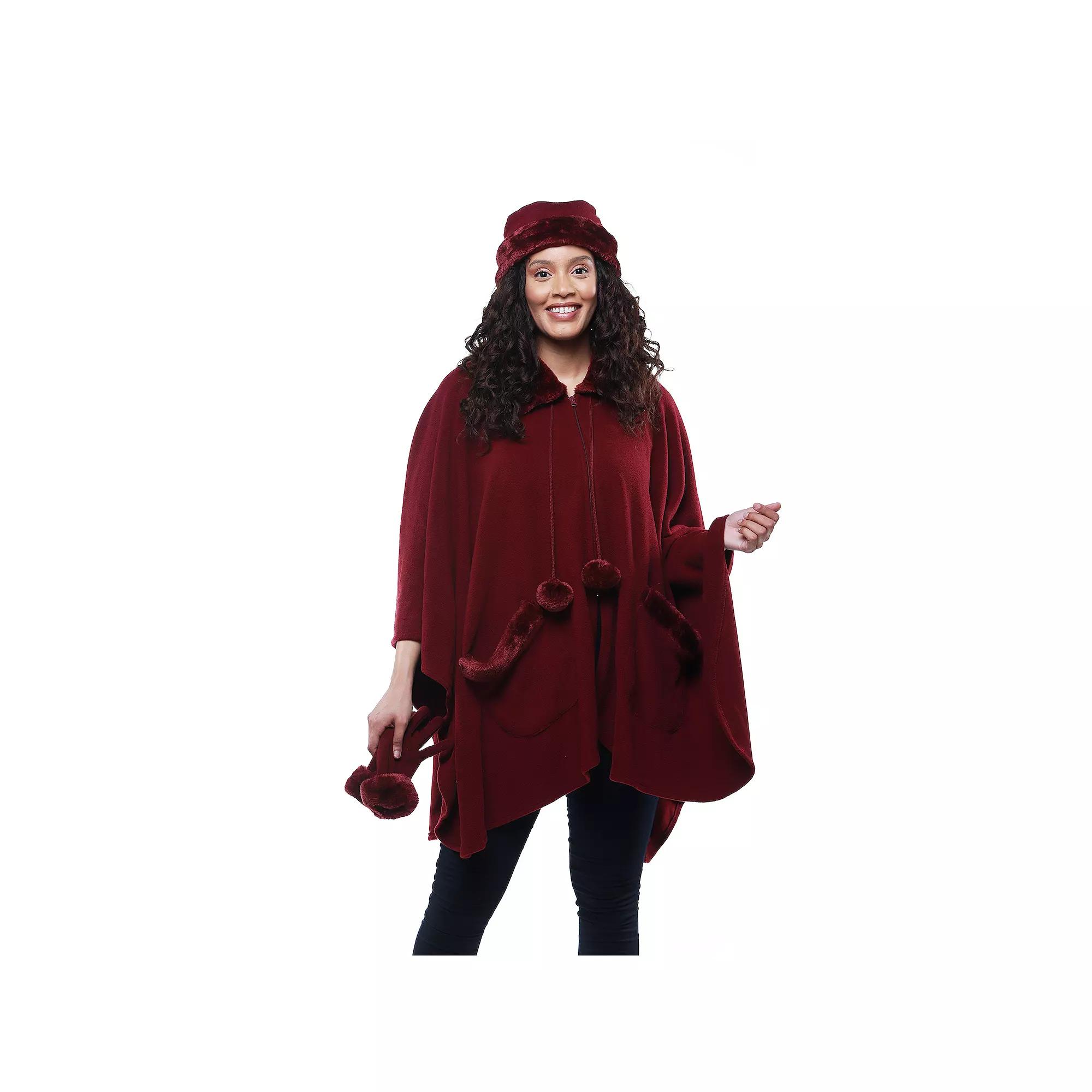 Scarves & Shawls by Lord Daniel Sportswear. Comes in Wine, Size N/A. • Faux Fur Fleece Wrap, Glove & Hat Set. Zip front wrap with pom pom ties. Patch pockets. Faux fur on collar, pocket trim and collar. Matching fleece hat with faux fur trim. Matching fleece gloves with faux fur trim. 100% polyester. Machine washable. One size. Imported.