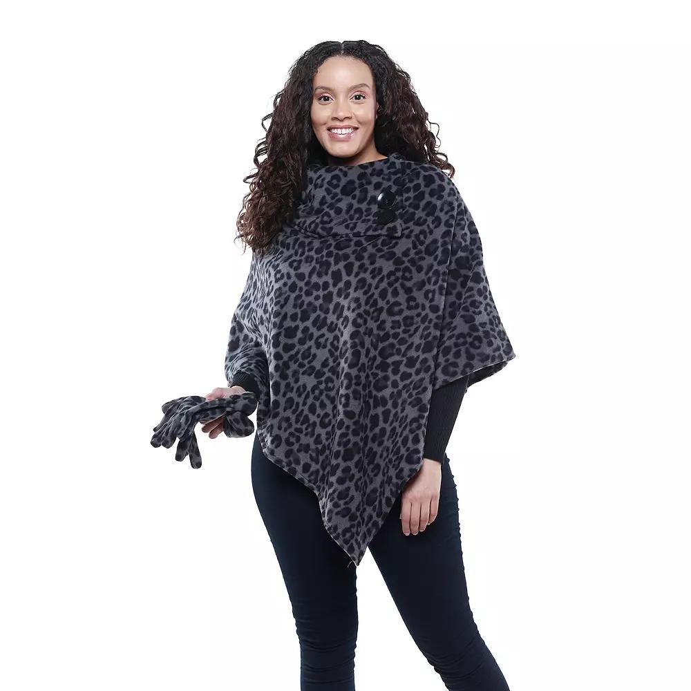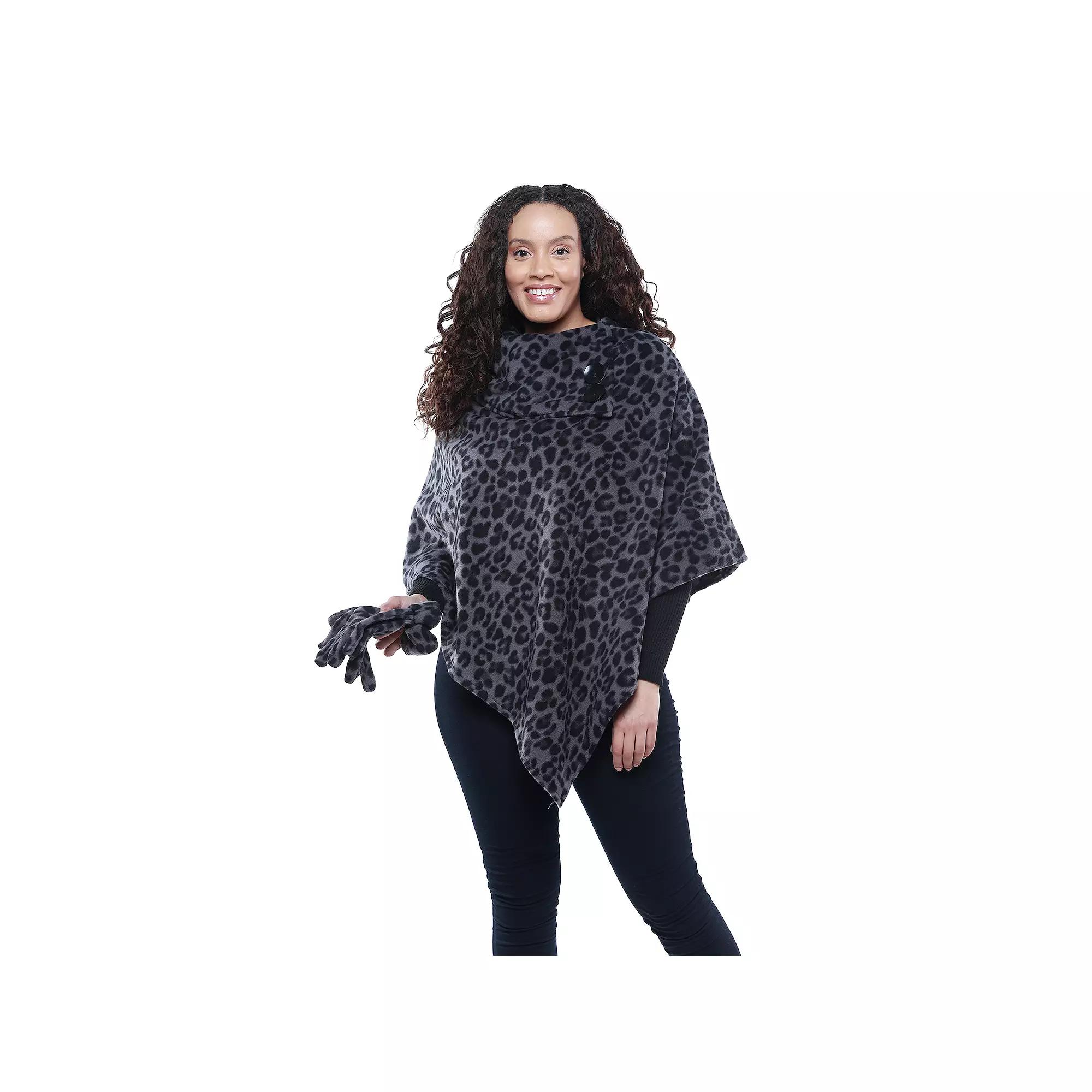 Scarves & Shawls by Lord Daniel Sportswear. Comes in Black/Grey Leopard, Size N/A. • Printed Fleece Poncho and Glove Set. Foldover fashion collar. Two decorative buttons. Matching printed fleece gloves. 100% polyester. Machine washable. One size. Imported.