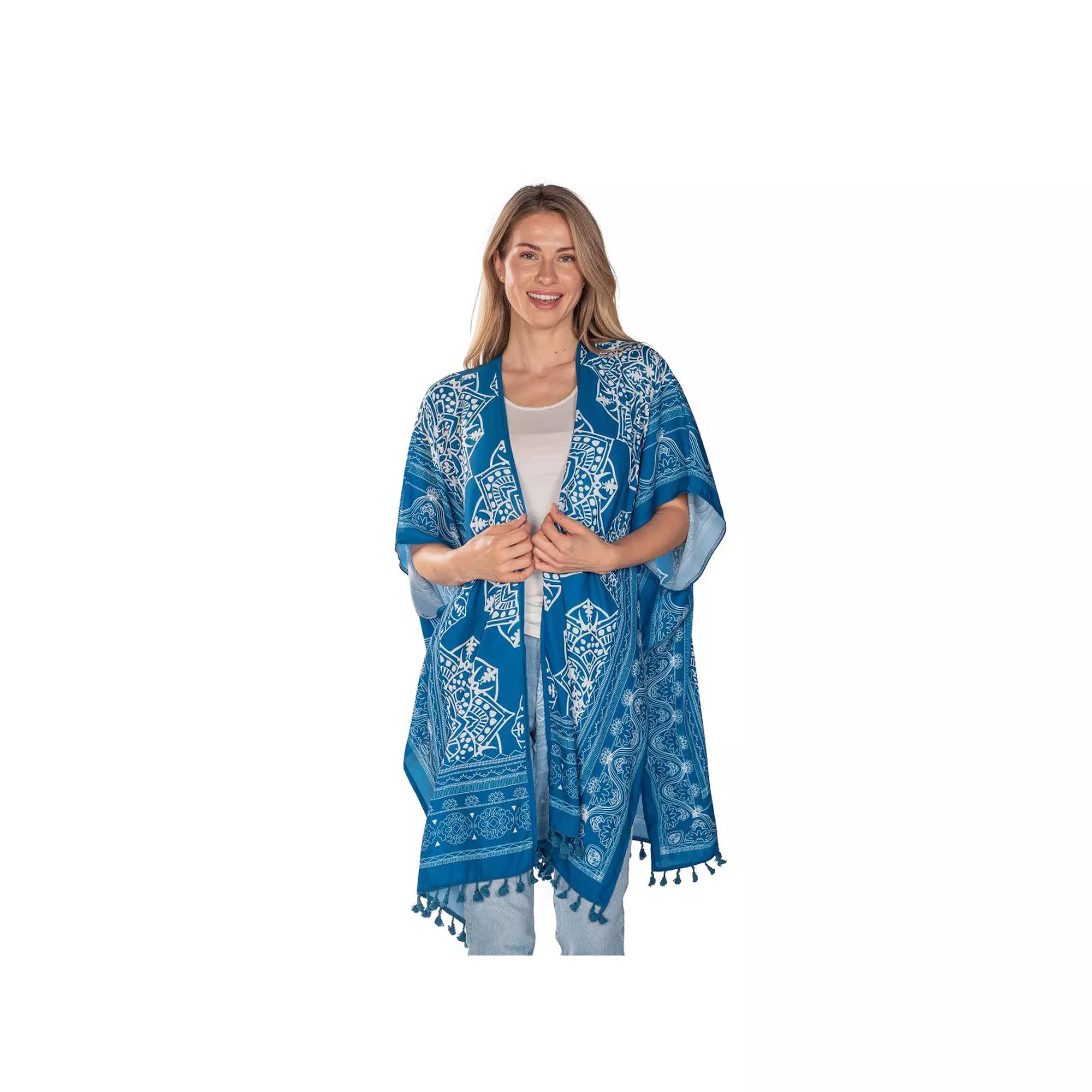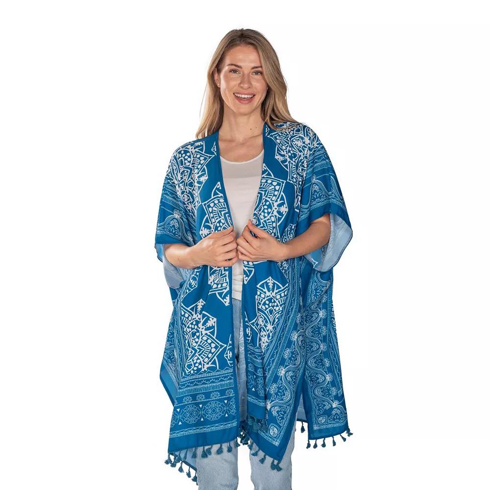 Elevate your style with this stunning kimono from Linda Anderson, featuring a sophisticated teal blue print and playful tasseled trim. Perfect for layering over your favorite beachwear or pairing with a chic ensemble for a night out, this lightweight piece effortlessly combines flair and versatility, allowing you to tie it up or let it flow wherever your adventures take you. How do you accessorize? Check out our ACCESSORIES GUIDE for essential tips to elevate your style with must-have accessories.Elevate your style with this stunning kimono from Linda Anderson, featuring a sophisticated teal blue print and playful tasseled trim. Perfect for layering over your favorite beachwear or pairing with a chic ensemble for a night out, this lightweight piece effortlessly combines flair and versatility, allowing you to tie it up or let it flow wherever your adventures take you. How do you accessorize? Check out our ACCESSORIES GUIDE for essential tips to elevate your style with must-have accessories.FEATURES Allover print Lightweight Arm openingsFABRIC & CARE Polyester Machine wash Imported Size: One Size. Gender: female. Age Group: adult.