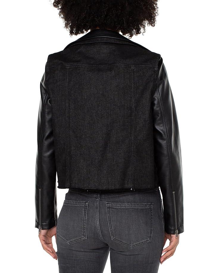 Featuring a hybrid design and premium black comfort stretch, the Liverpool™ Denim Hybrid Moto Jacket is a must-have in your wardrobe. The jacket comes with a notch lapel collar, long sleeves, and a full button closure. The button flap pockets on the chest are designed for functionality.