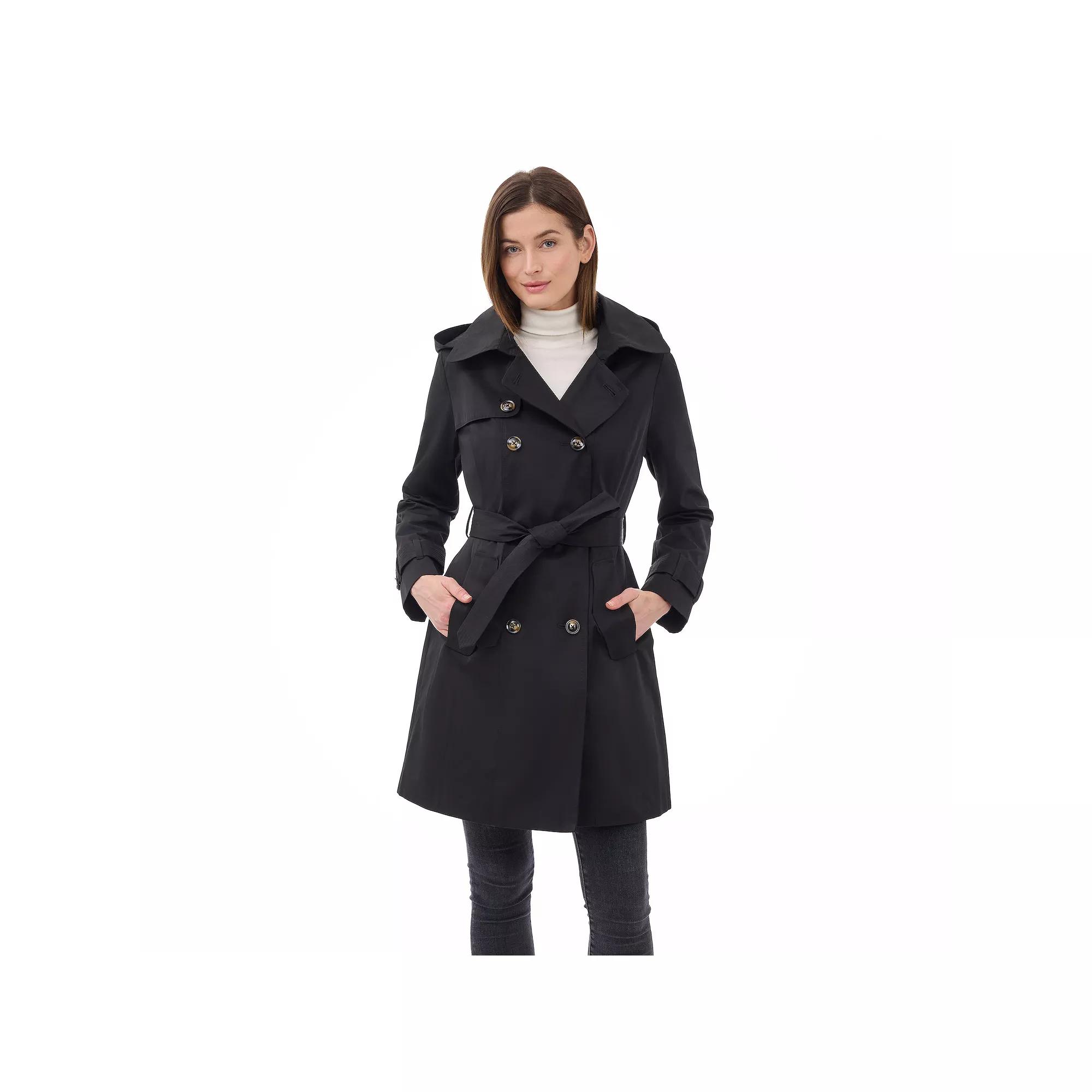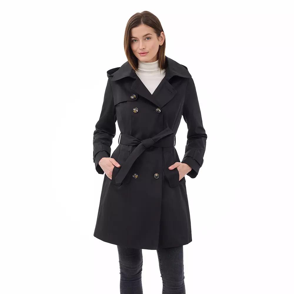 Stay effortlessly chic in any weather with this stylish double trench coat from London Fog. Perfect for everyday wear or special occasions, this water-resistant piece not only offers sleek sophistication but also practical protection from the elements. Click on this WOMEN'S GUIDE to find the perfect fit and more! - https://www.kohls.com/feature/womens-fit-guide.jsp. FEATURES: Woven construction, Removable hood, Long sleeves, Snap & zipper closure, Water-resistant technology, 2 welt pockets at front, Coordinating belt, Fully lined. FIT & SIZING: Semi fitted, 37-in. length from shoulder to hem, Designed to hit above the knees, Lightweight. FABRIC & CARE: Cotton, polyester, Polyester lining, Machine wash and tumble dry low, Imported. Size: Large. Color: Black. Gender: female. Age Group: adult.