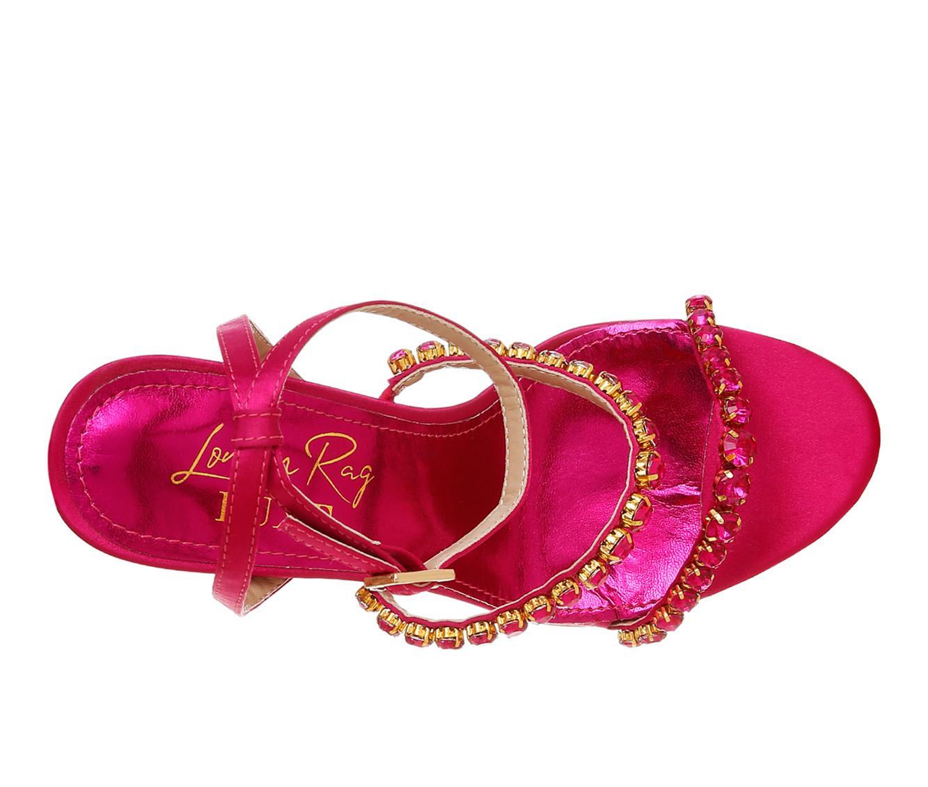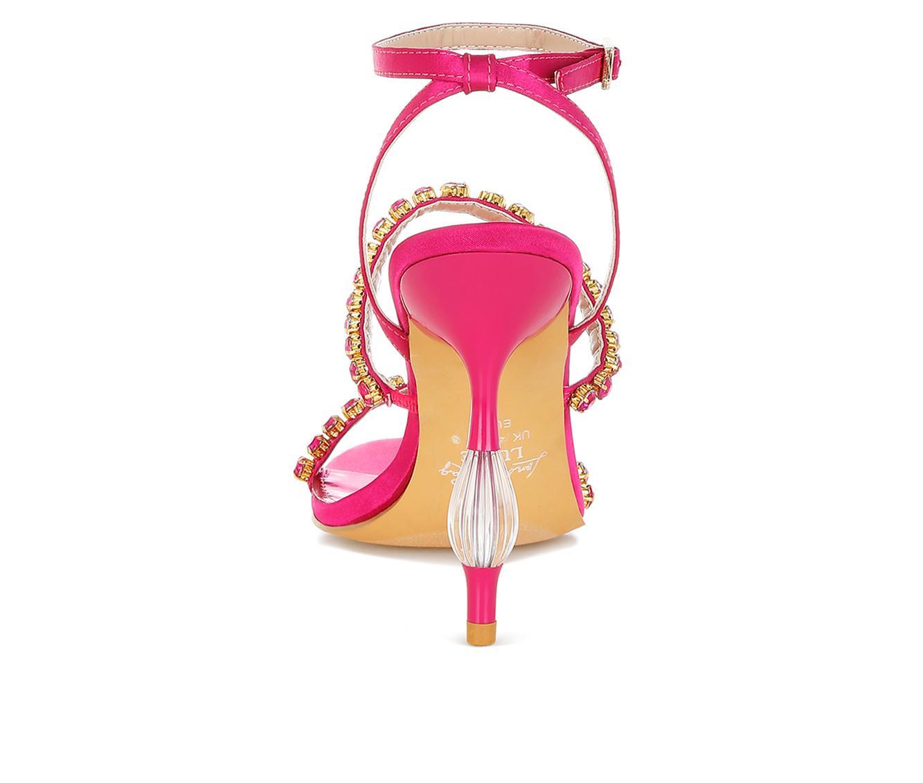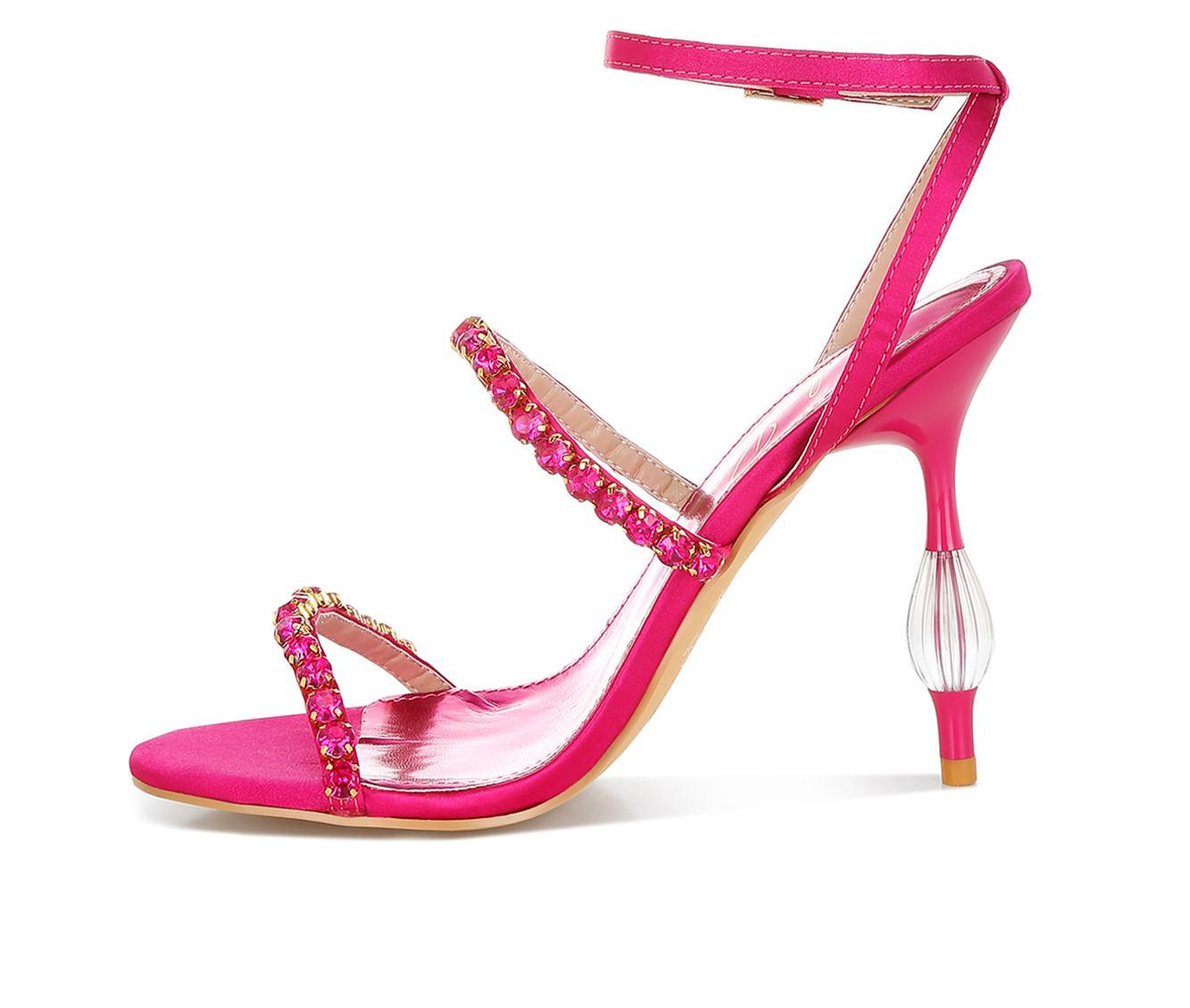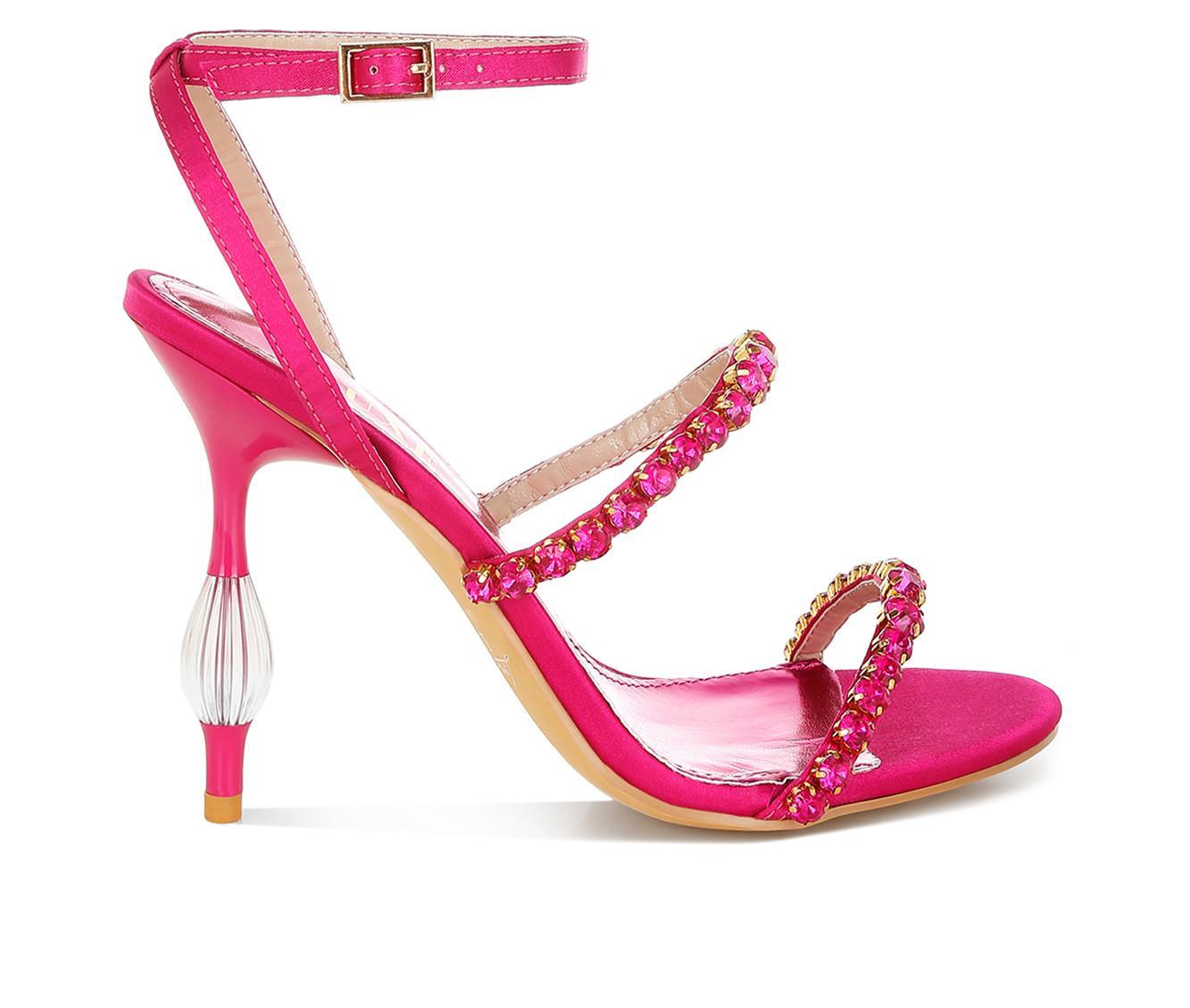 A dazzling dress heel with sculptural flair and elegant sparkle. Featuring a faux satin upper with rhinestone-trimmed straps and a delicate ankle buckle, this open-toe sandal is lifted by a decorative stiletto heel with a unique orb-like accent for elevated evening looks.