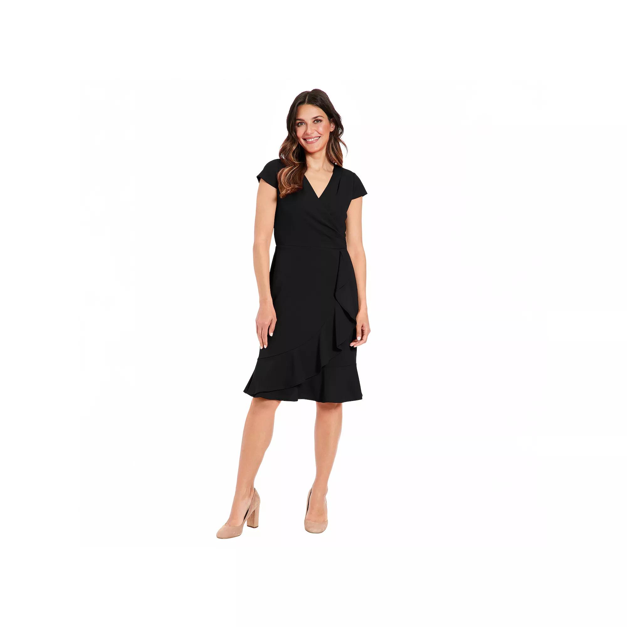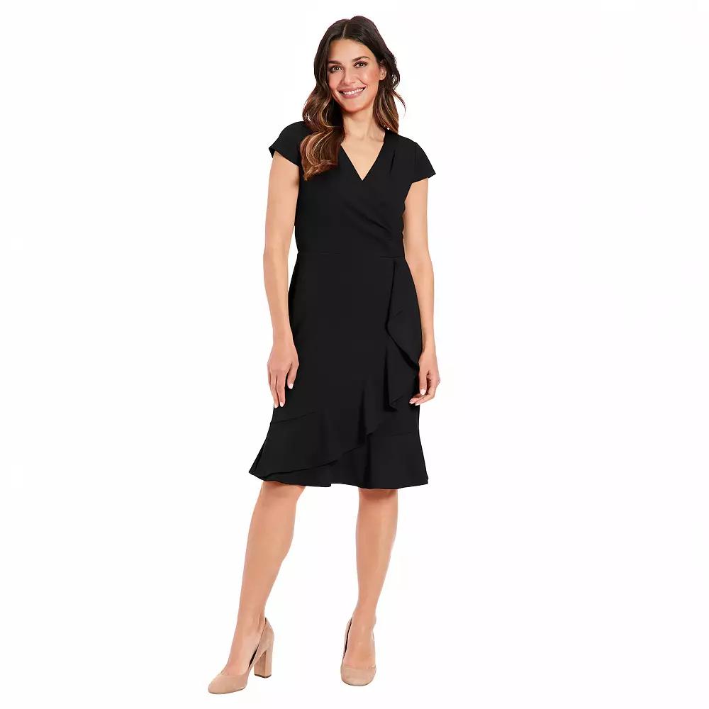 Embrace chic style with this womens Short Sleeve Ruffle Wrap Dress from London Times.Click on this WOMENS GUIDE to find the perfect fit and more! Embrace chic style with this womens Short Sleeve Ruffle Wrap Dress from London Times.Click on this WOMENS GUIDE to find the perfect fit and more! FEATURES V-neck Short sleeves Zipper back Ruffled hem Partially lined Scuba crepe constructionFIT & SIZING Sheath silhouette 41 1/2-in. length from shoulder to hem Mini length hits at the thighFABRIC & CARE Polyester, spandex Lining: polyester Machine wash Imported Size: 8. Color: Black. Gender: female. Age Group: adult.