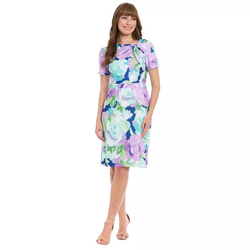 This stylish women's side tie-neck sheath mini dress from London Times is sure to quickly become a favorite in your wardrobe.Click on this WOMEN'S GUIDE to find the perfect fit and more!This stylish women's side tie-neck sheath mini dress from London Times is sure to quickly become a favorite in your wardrobe. Click on this WOMEN'S GUIDE to find the perfect fit and more!FEATURES Sheath silhouette Asymmetrical, side bow-tie neckline Zipper back closure Short sleeves Straight hem Floral print Scuba crepe construction is soft to the touch Partially linedFIT & SIZING Fitted straight 39-in. length from shoulder to hem Mini length hits at the thighFABRIC & CARE Body: polyester, spandex Lining: polyester Machine wash Imported Size: 10. Color: Navy Peri. Gender: female. Age Group: adult.
