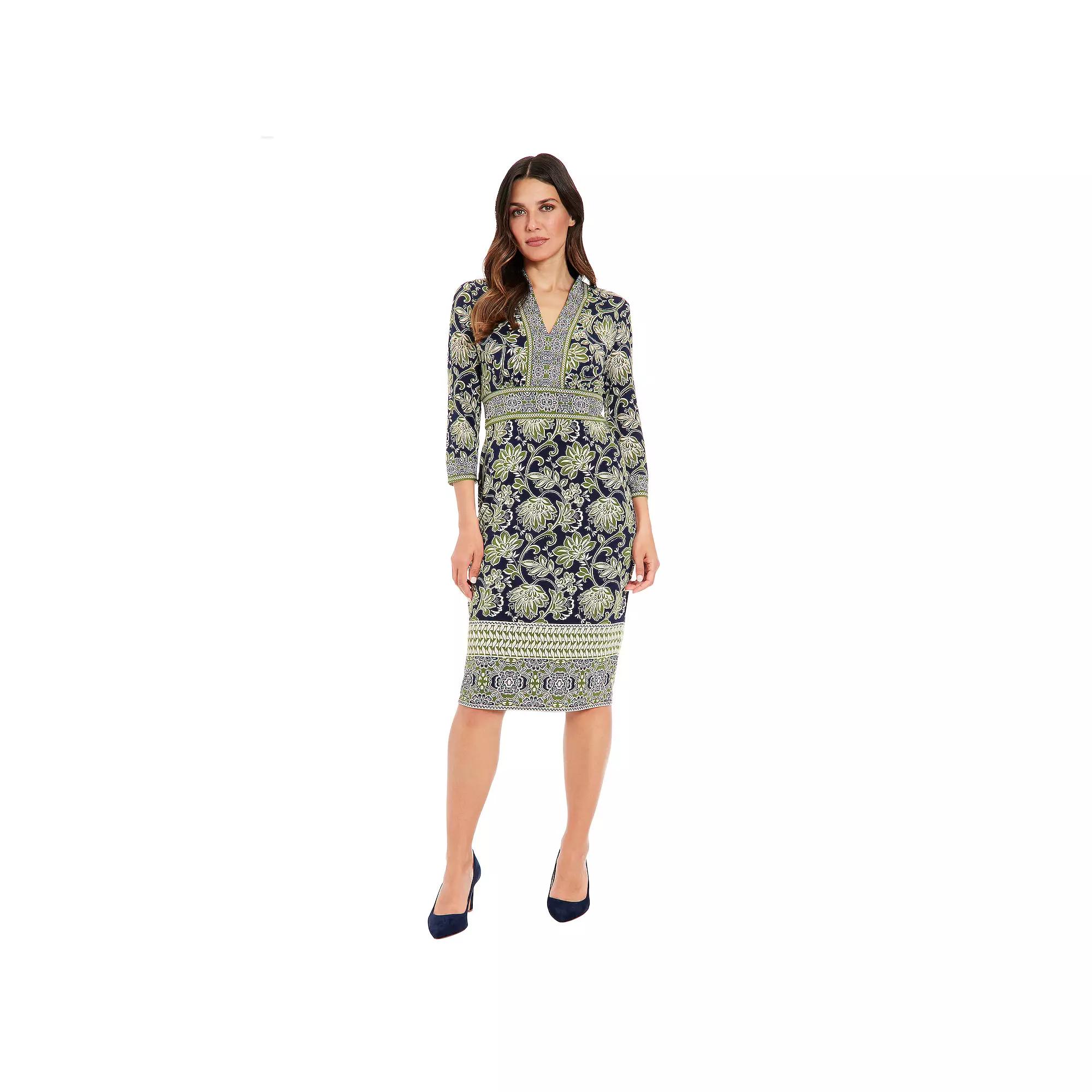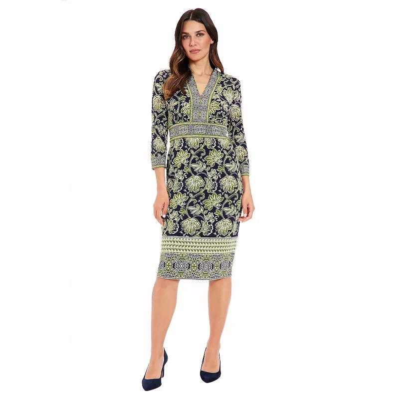 Refresh your wardrobe with this womens London Times v-neck sheath inset waist dress.Click on this WOMENS GUIDE to find the perfect fit and more! Refresh your wardrobe with this womens London Times v-neck sheath inset waist dress.Click on this WOMENS GUIDE to find the perfect fit and more! FEATURES V-neck 3/4-length sleeves Inset waist Sheath silhouette Soft matte jersey construction Straight hem Zipper back Partially linedFIT & SIZING Fitted straight style 43-in. length from shoulder to hem Midi length hits below the kneeFABRIC & CARE Polyester, spandex Lining: polyester Machine wash and tumble dry low Imported Size: 8. Color: Navy Green Floral. Gender: female. Age Group: adult.