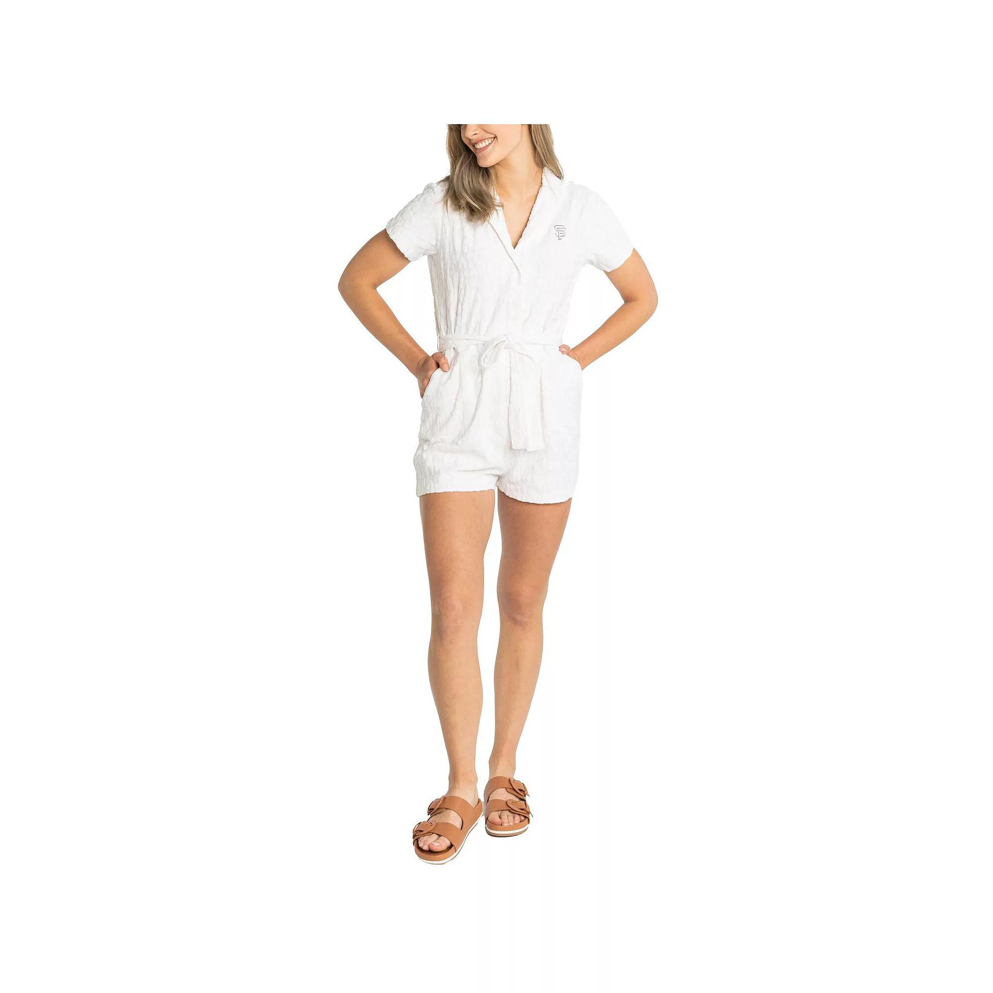 This San Francisco Giants Trixie romper by Lusso is the ultimate piece for when youre in that, I have no idea what to wear but I want to stay comfy and cute, type of mood. Offering an elastic band on the back, side pockets and ultra-soft terry fabric, this romper ensures comfort with every wear. The striking cheetah print pattern and subtle San Francisco Giants embroidery bring spirit to your outfit while the self-tie belt around the waist adds more shape for a flattering look.This San Francisco Giants Trixie romper by Lusso is the ultimate piece for when youre in that, I have no idea what to wear but I want to stay comfy and cute, type of mood. Offering an elastic band on the back, side pockets and ultra-soft terry fabric, this romper ensures comfort with every wear. The striking cheetah print pattern and subtle San Francisco Giants embroidery bring spirit to your outfit while the self-tie belt around the waist adds more shape for a flattering look.Embroidered graphicsOfficially licensedFabric self-tie beltOutseam on size S measures approx. 24Brand: LussoMaterial: 100% CottonShort sleeveImportedInseam on size S measures approx. 2Hand wash, dry flatTextured terry fabricElastic back waist Size: 2X. Color: White. Gender: female. Age Group: adult.