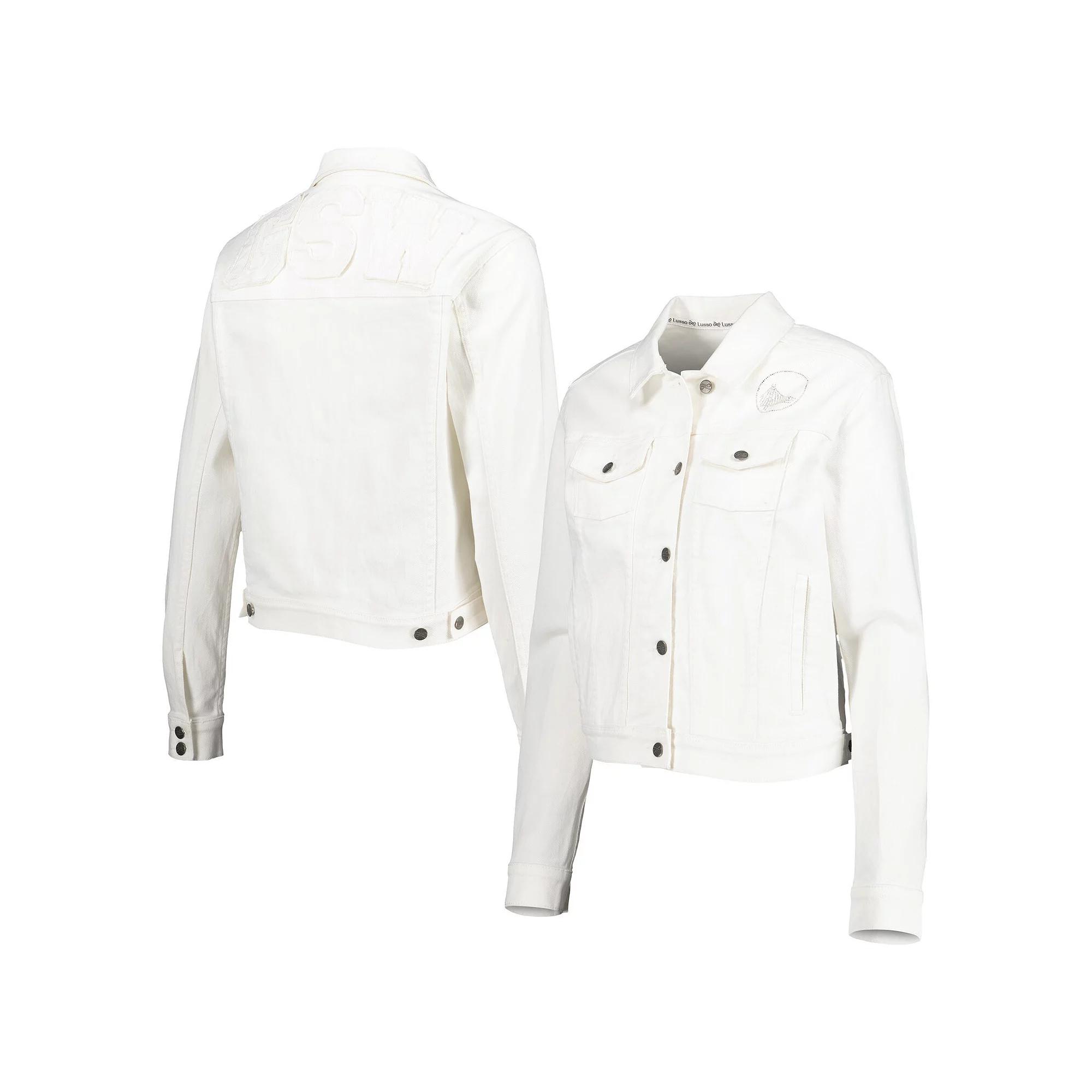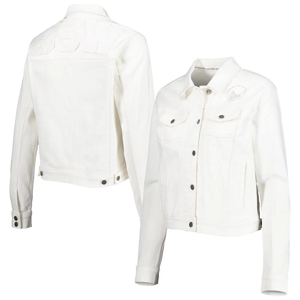Elevate your Golden State Warriors style with this exquisite Lusso Swarovski Crystal & Distressed Button-Up Denim Jacket. This midweight jacket is perfect for game day, with its adjustable cuffs, full-button front, and two buttoned chest pockets. The crystalized Golden State Warriors logo on the chest and the woven fabric appliques with distressed details show off your team spirit in style. Whether you're courtside or watching from home, this jacket will have you looking and feeling like an NBA champion. Officially licensed. Woven fabric appliques with distressed details. Two front pockets. Brand: Lusso. Hand wash, line dry. Material: 98% Cotton/2% Spandex. Two buttoned chest pockets. Crystalized team logo on chest. Midweight jacket suitable for moderate temperatures. Long sleeve. Full-button front. Adjustable cuffs with button closures. Imported. Color: White. Gender: female. Age Group: adult.