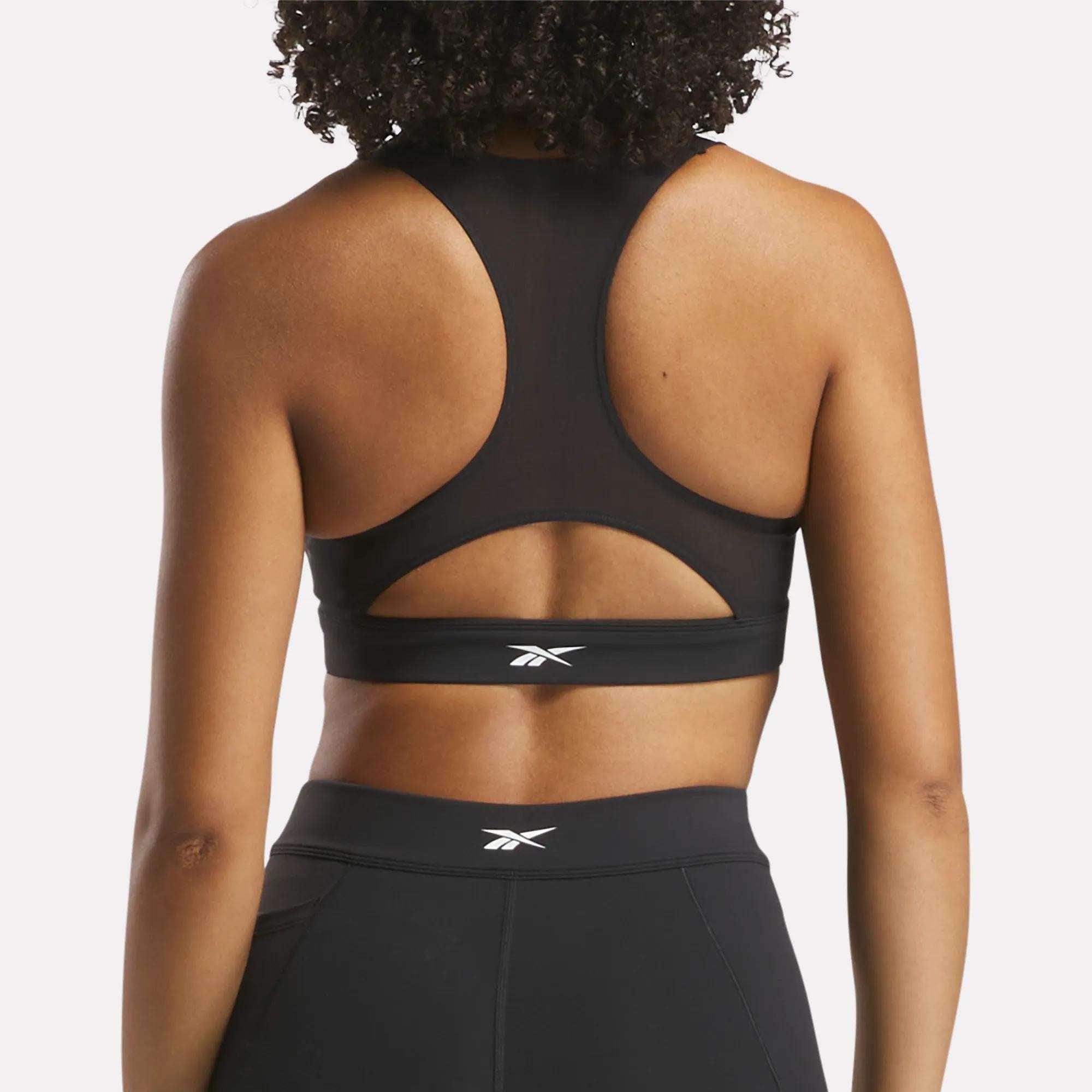 A racer back sports bra designed for medium impact movementsThis medium-support sports bra from Reebok helps you handle any workout, anytime. Made of soft Nylux fabric with a second-skin feel, it has inner cups for shaping and support. The racer back design gives you freedom of movement so you can ace every push up and overhead lift.