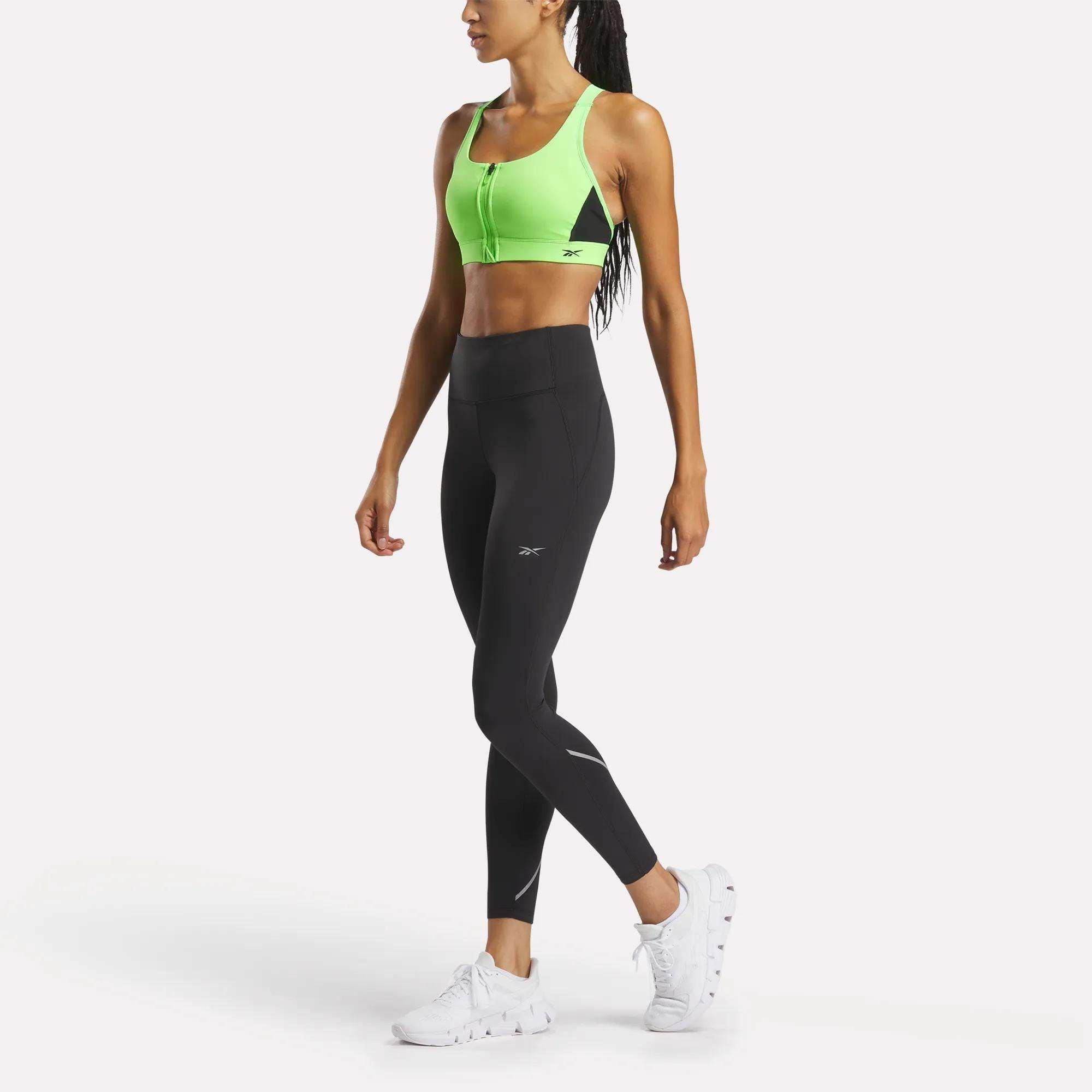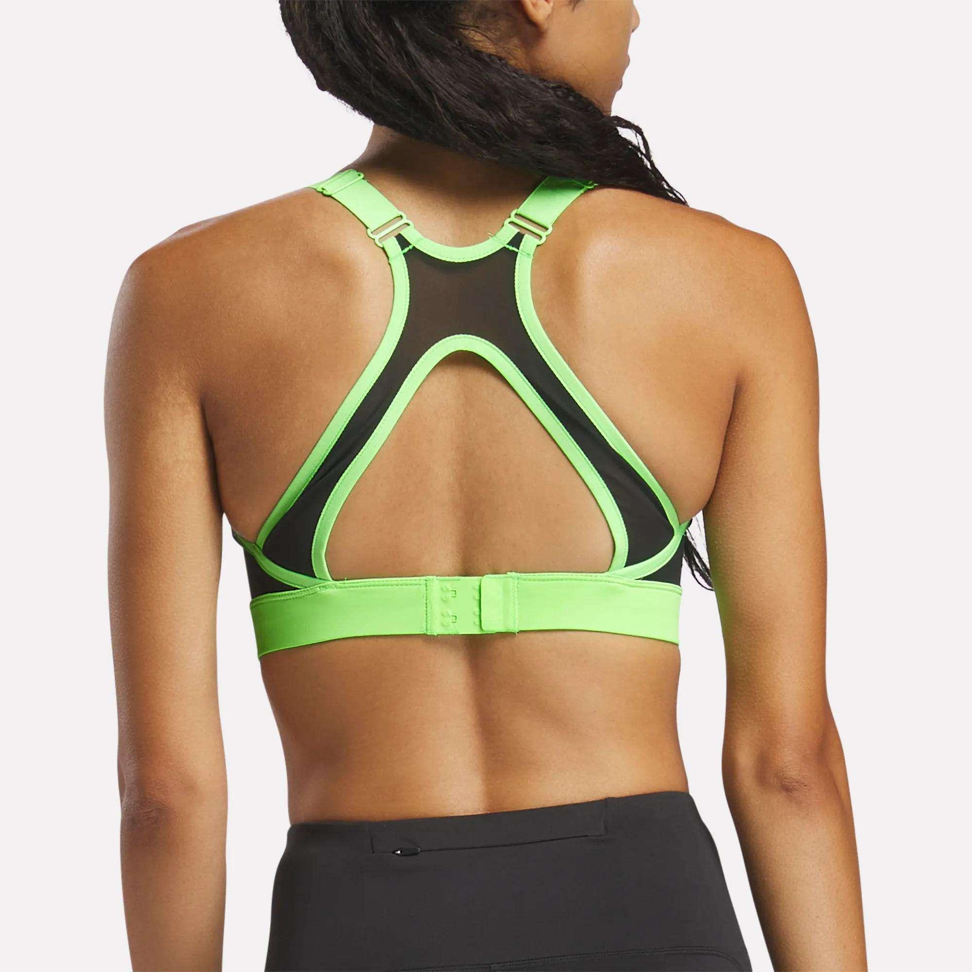 A sweat-wicking sports bra that offers high support From running to jump-rope drills, this Reebok sports bra offers support for high-impact activities. Performance fabric wicks away sweat to help you stay cool and dry. A hook-and-loop back clasp and front zip allow you to customize your fit.