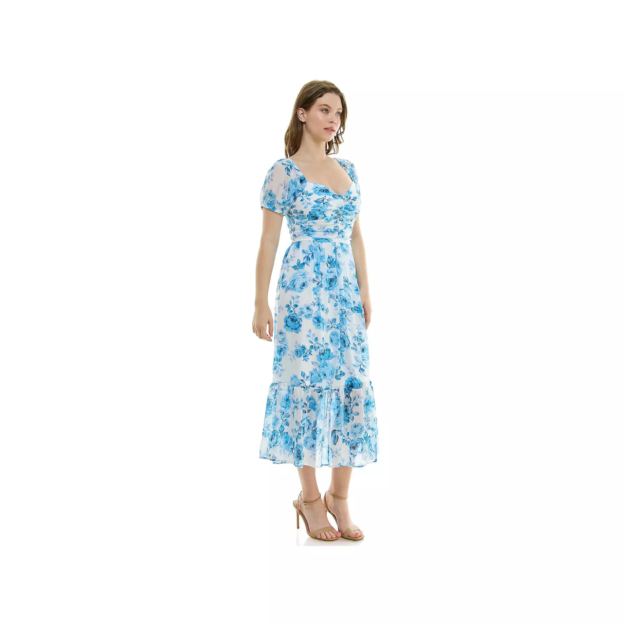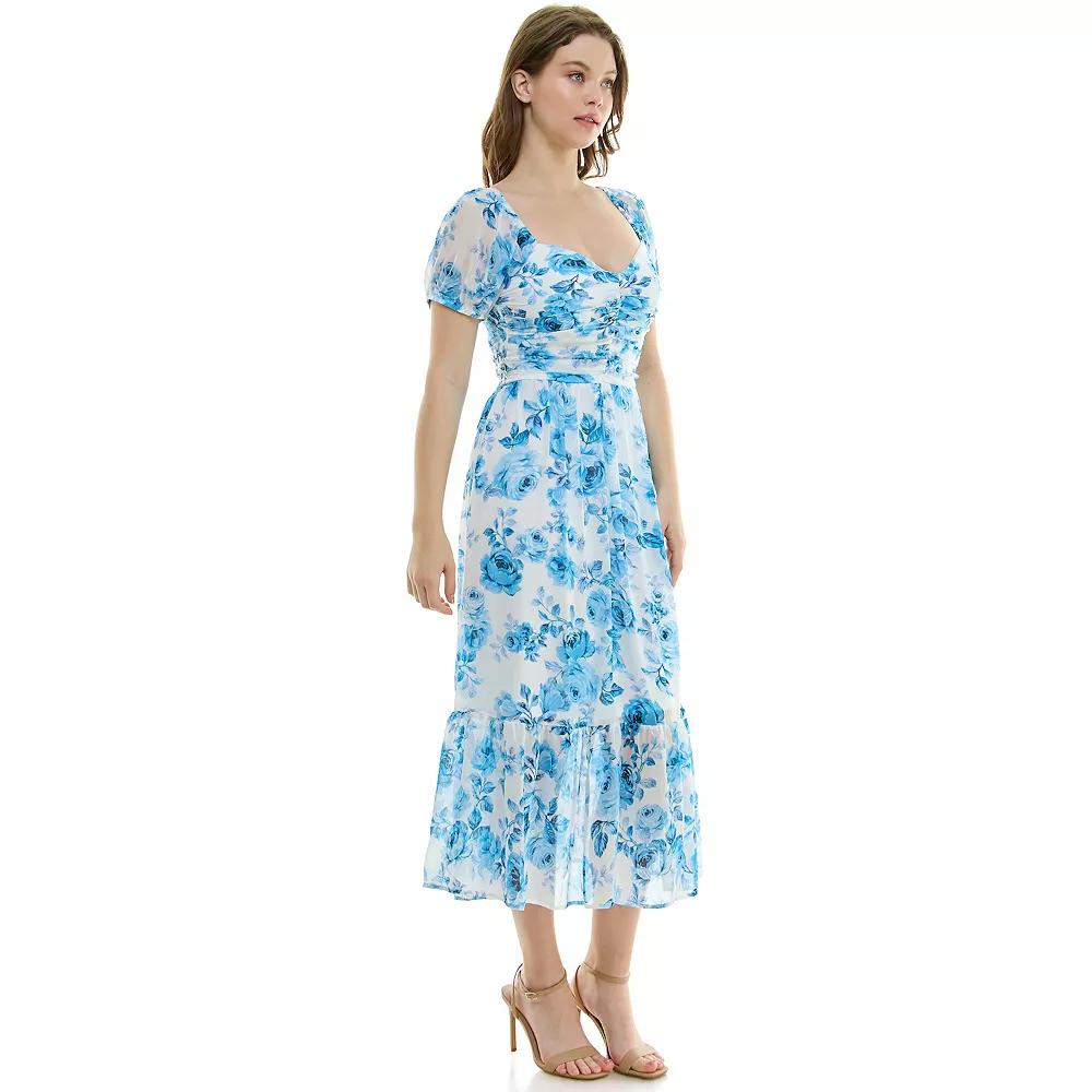 Kick your wardrobe up a notch with Luxology. This dress features a rose floral design on sheer lightweight woven fabric, fully lined, sweetheart neckline with ruched detail, sheer puff shoulders, smocked back and ruffle hemline. Measures approximately 49 in from shoulder.