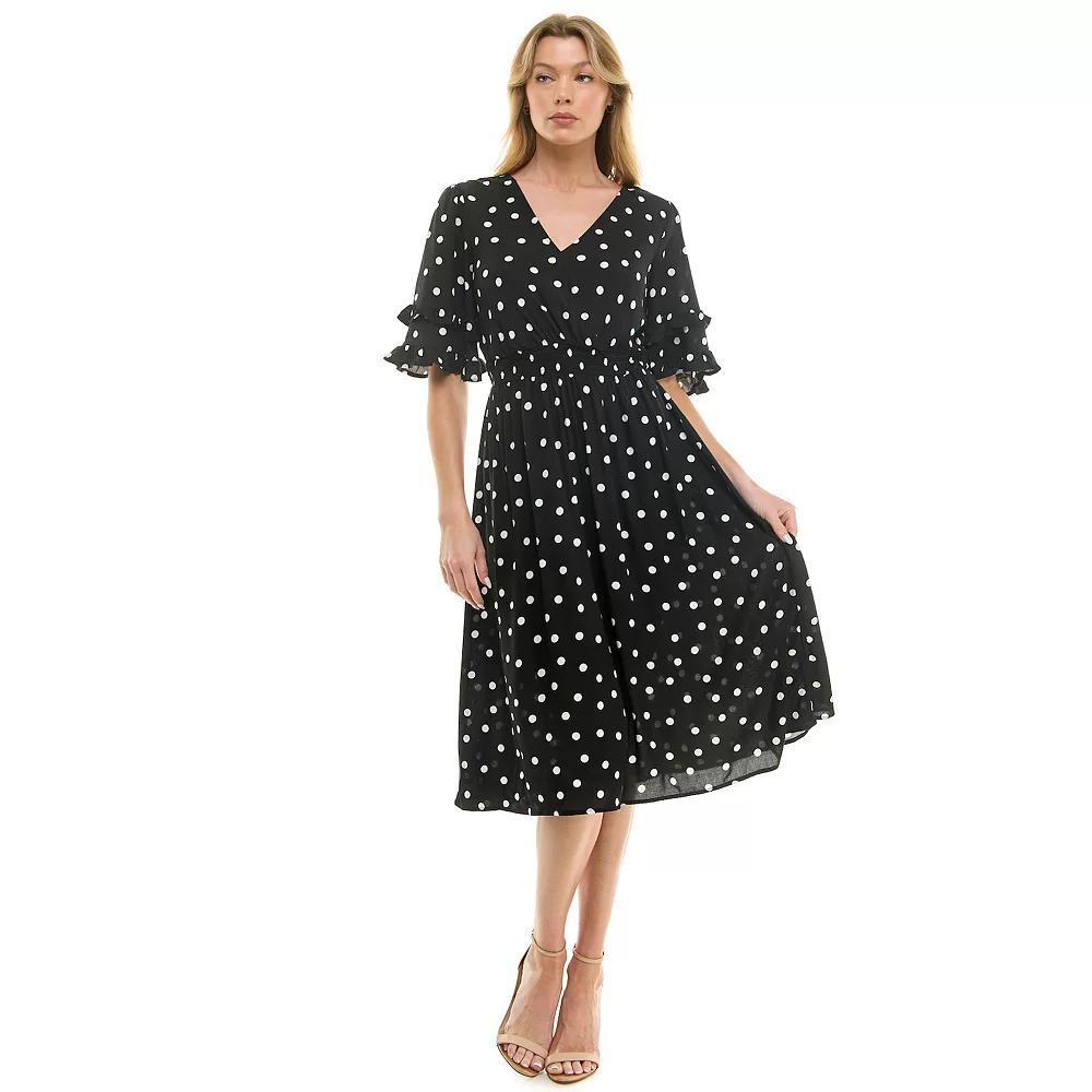 Enjoy a nice spring day wearing this womens Luxology smocked waist surplice dress. Click on this WOMENS GUIDE to find the perfect fit and more!Enjoy a nice spring day wearing this womens Luxology smocked waist surplice dress. Click on this WOMENS GUIDE to find the perfect fit and more!FEATURES V-neck Short tiered ruffle sleeves Snap front closure Fit & flare silhouette Woven constructionFIT & SIZING Relaxed fit 45-in. from shoulder to hem Midi length hits below the knee Elastic waistbandFABRIC & CARE Rayon Machine wash and line dry Imported Size: Small. Color: Black Cream. Gender: female. Age Group: adult.