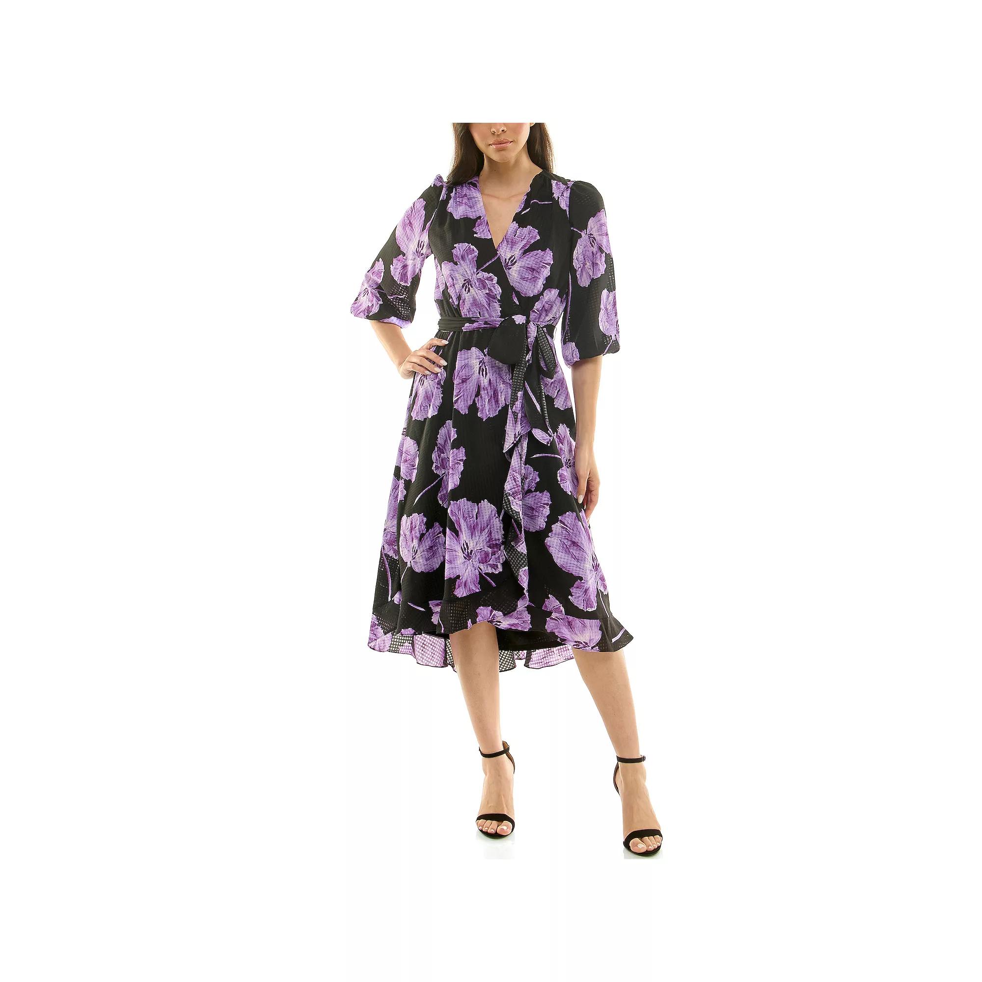 Embrace effortless elegance with this stunning midi dress that features a chic faux wrap design and a playful ruffle hem. With a self-sash belt to highlight your waist, Maison Tara has assured you'll feel lovely whether you’re at brunch with friends or dancing the night away. Click on this WOMEN'S GUIDE to find the perfect fit and more! - https://www.kohls.com/feature/womens-fit-guide.jsp. FEATURES: Lightweight chiffon for a breezy feel, Faux wrap styling with ruffle hem and self sash belt. FIT & SIZE: Fitted at bodice with soft A-line skirt, Faux-wrap silhouette, 47-in. length from shoulder to hem, High-low hem. MATERIAL & CARE: Polyester, Fully lined, Hand wash and line dry. DETAILS: Zipper back closure, Front-tie sash, Surplice neckline, 3/4-length sleeves with set-in design, Elastic cuffs, Imported. Size: 6. Color: Black Iris. Gender: female. Age Group: adult. Pattern: check. Material: COTTON / SATEEN.
