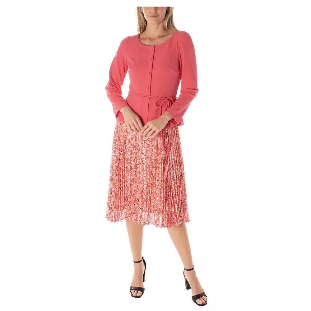 Refresh your wardrobe with this women's Maison Tara faux 2-piece jacket & skirt set. Click on this WOMEN'S GUIDE to find the perfect fit and more!Refresh your wardrobe with this women's Maison Tara faux 2-piece jacket & skirt set. Click on this WOMEN'S GUIDE to find the perfect fit and more!FEATURES 2-piece set includes: jacket and skirt Skirt: fit & flare silhouette, coordinating sash Jacket: Bracelet set-in sleeves, scoopneck Soft woven construction Straight hem Zipper closure Fully linedFIT & SIZING Fitted bodice, flowy skirt 45 1/2-in. length from shoulder to hem Midi length hits below the knee Cinched waistbandFABRIC & CARE Body: polyester, spandex Lining: polyester Hand wash Imported Size: 6. Color: Coral Team. Gender: female. Age Group: adult. Pattern: floral.