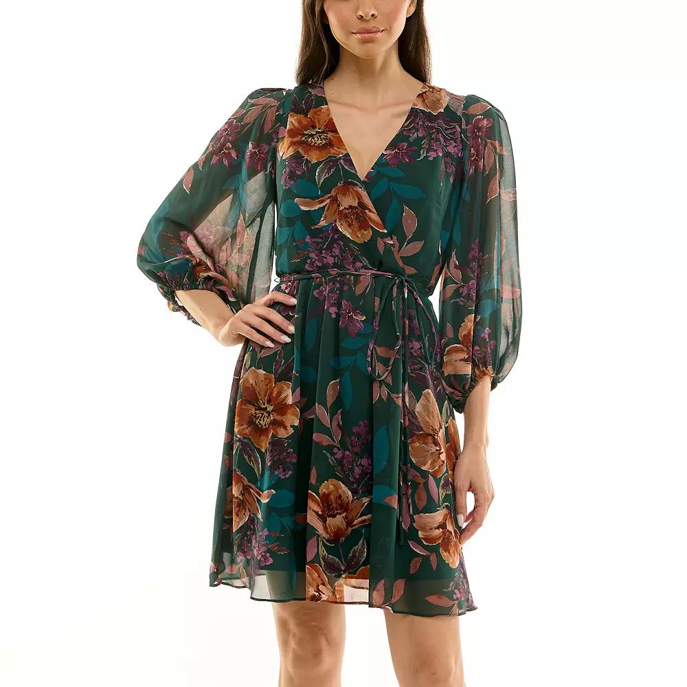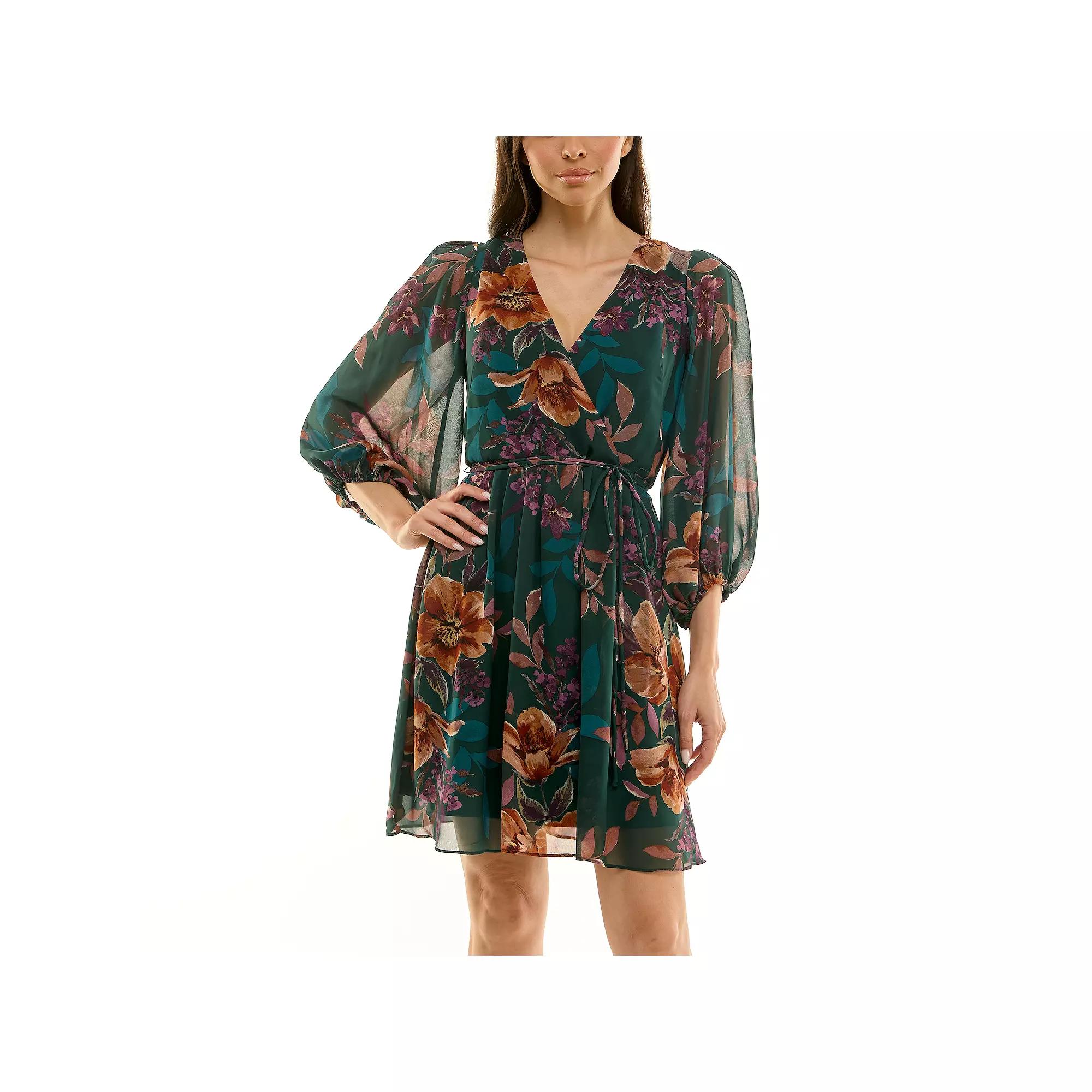 Embrace effortless elegance with this charming faux wrap dress that dances with floral prints and features delightful puffed sleeves. Perfect for brunch with friends or a stroll in the park, you'll feel fabulous and utterly confident in this Maison Tara piece as you twirl through your day. Click on this WOMEN'S GUIDE to find the perfect fit and more! - https://www.kohls.com/feature/womens-fit-guide.jsp. FEATURES: Lightweight chiffon construction, Flowy silhouette for effortless movement. FIT & SIZE: Fitted at bodice with a line skirt, Faux-wrap silhouette, 37 1/4-in. length from shoulder to hem, Straight hem. MATERIAL & CARE: Polyester, Fully lined, Hand wash and line dry. DETAILS: Zipper back closure, Front-tie sash, Surplice neckline, 3/4-length sleeves, Set-in sleeves with elastic cuffs, Imported. Size: 8. Color: Teal. Gender: female. Age Group: adult.