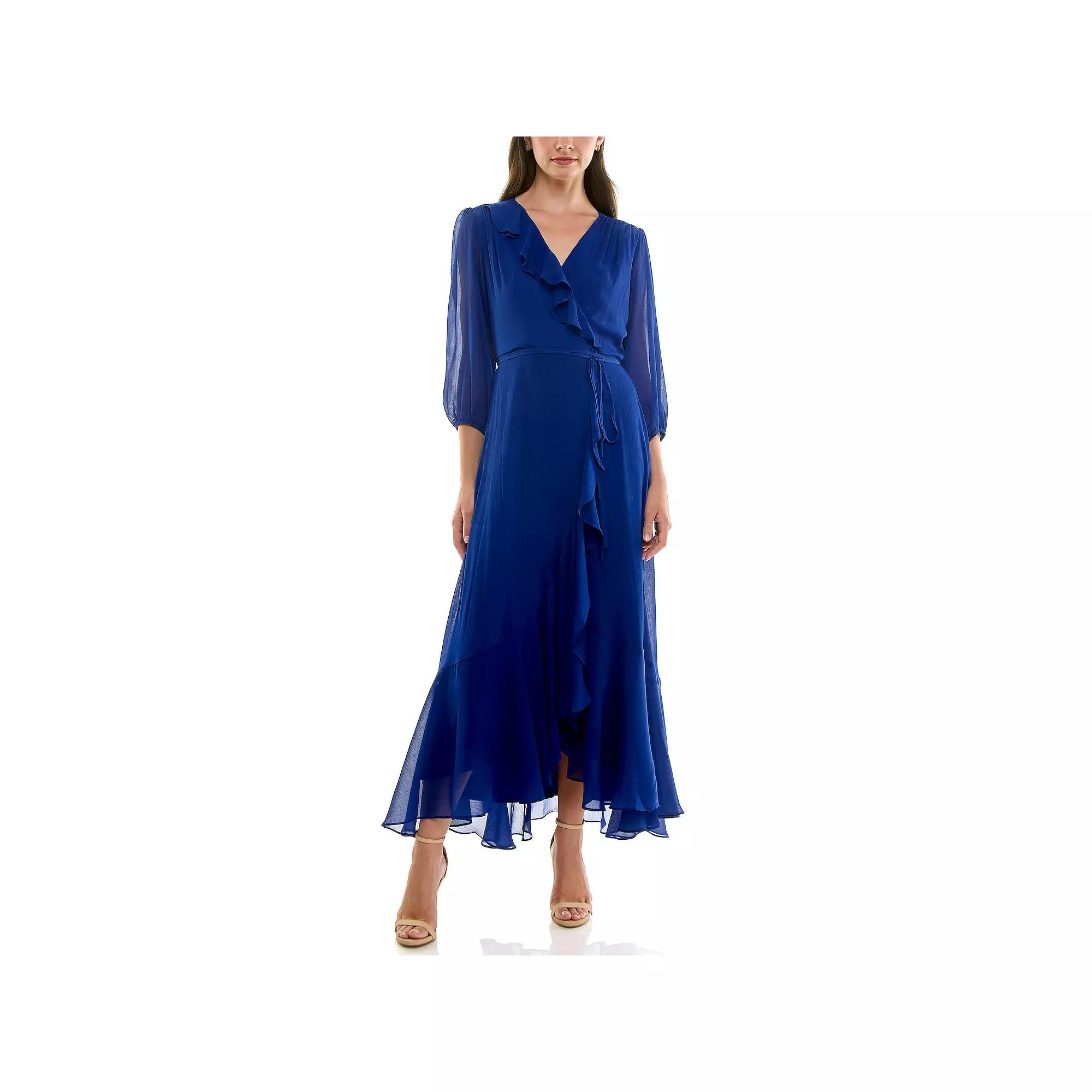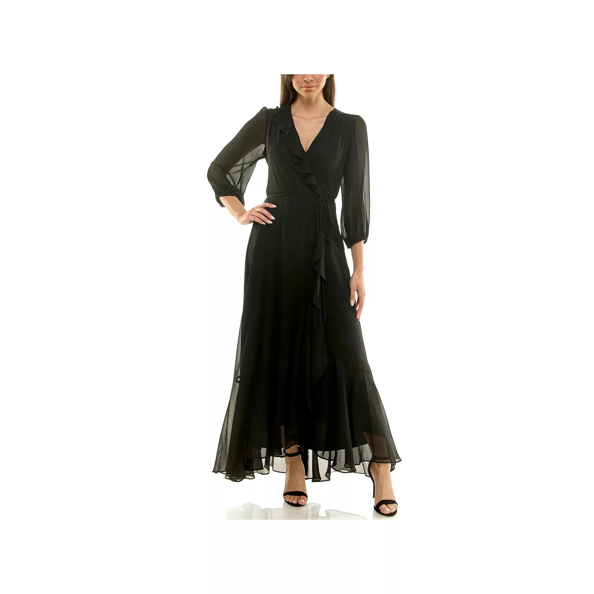 This feminine women's maxi dress from Maison Tara has sheer balloon sleeves, ruffled detailing with a classic faux-wrap silhouette. Click on this WOMEN'S GUIDE to find the perfect fit and more! - https://www.kohls.com/feature/womens-fit-guide.jsp. FEATURES: V-neck, Balloon sleeves, Coordinating sash, Soft chiffon construction, Ruffled hem, No pockets, Fully lined. FIT & SIZING: 57 1/2-in. length from shoulder to hem, Maxi length hits at the ankle, Back-elastic waistband, Faux-wrap silhouette, Zipper closure. FABRIC & CARE: Polyester, Lining: Polyester, Hand wash, Imported. Size: 4. Color: Black. Gender: female. Age Group: adult. Material: WOVEN.