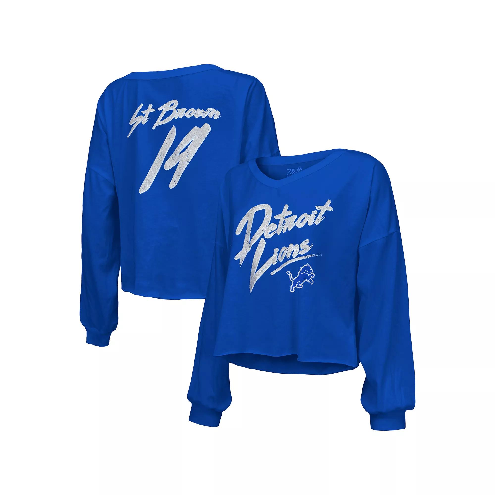 Add some trendy flair to your Detroit Lions game day look with this Majestic Threads Amon-Ra St. Brown Off-Shoulder Script Long Sleeve Name & Number V-Neck Cropped T-Shirt. This stylish top features dropped shoulder seams for a relaxed fit, making it the perfect choice for casual game days or outings with fellow Detroit Lions fans. Its eye-catching design includes a distressed screen print of Amon-Ra St. Brown's name and number, ensuring your Detroit Lions pride is on full display.Add some trendy flair to your Detroit Lions game day look with this Majestic Threads Amon-Ra St. Brown Off-Shoulder Script Long Sleeve Name & Number V-Neck Cropped T-Shirt. This stylish top features dropped shoulder seams for a relaxed fit, making it the perfect choice for casual game days or outings with fellow Detroit Lions fans. Its eye-catching design includes a distressed screen print of Amon-Ra St. Brown's name and number, ensuring your Detroit Lions pride is on full display.PRODUCT FEATURESOfficially licensedLong sleeveDistressed screen print name and logo across the front with player name and number on the backMachine wash, tumble dry lowCropped, unfinished hemV-neckBrand: Majestic ThreadsMaterial: 100% CottonDropped shoulder seams provide a relaxed fit Color: Blue. Gender: female. Age Group: adult.