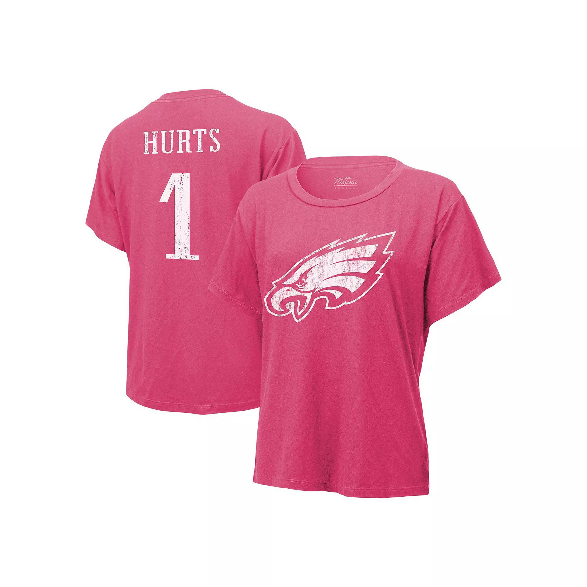 Like most Philadelphia Eagles fans, Jalen Hurts is one of your favorite players, so emphasize your fandom of the superstar by picking up this Name & Number T-shirt from Majestic Threads. It features his recognizable No. 1 in distressed fashion, which provides a look that stands out amongst the rest. The makeup of rayon and spandex make this eye-catching tee the best way to cheer on Jalen Hurts from opening kickoff to the end of the game.Like most Philadelphia Eagles fans, Jalen Hurts is one of your favorite players, so emphasize your fandom of the superstar by picking up this Name & Number T-shirt from Majestic Threads. It features his recognizable No. 1 in distressed fashion, which provides a look that stands out amongst the rest. The makeup of rayon and spandex make this eye-catching tee the best way to cheer on Jalen Hurts from opening kickoff to the end of the game.PRODUCT FEATURESDistressed screen graphicsMachine wash, tumble dry lowCrew neckOfficially licensedBrand: Majestic ThreadsShort sleeveMaterial: 95% Rayon/5% Spandex Color: Pink. Gender: female. Age Group: adult.